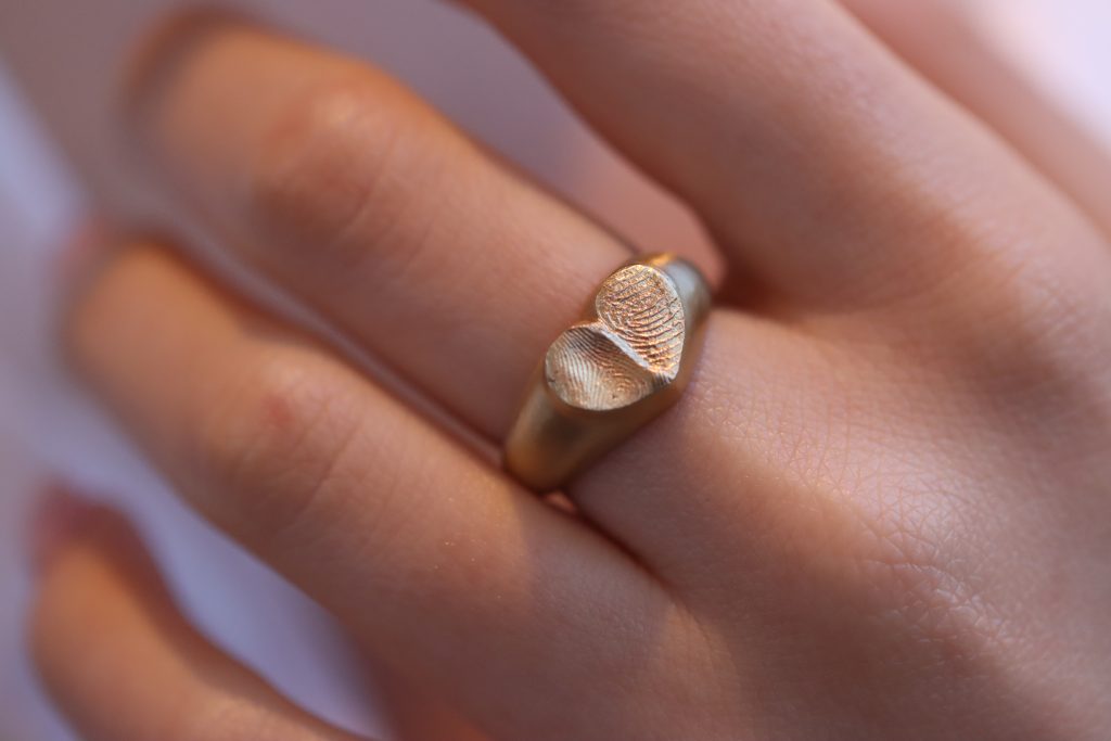 טבעת מרגשת ואישית עם טביעות אצבע של אהוביך בזהב 14k. טביעת האצבע תוטבע בטבעת בעבודת יד בטכניקה ייחודית. אנא התקשרו אלינו לתיאום החוויה המשותפת שלנו בסטודיו.