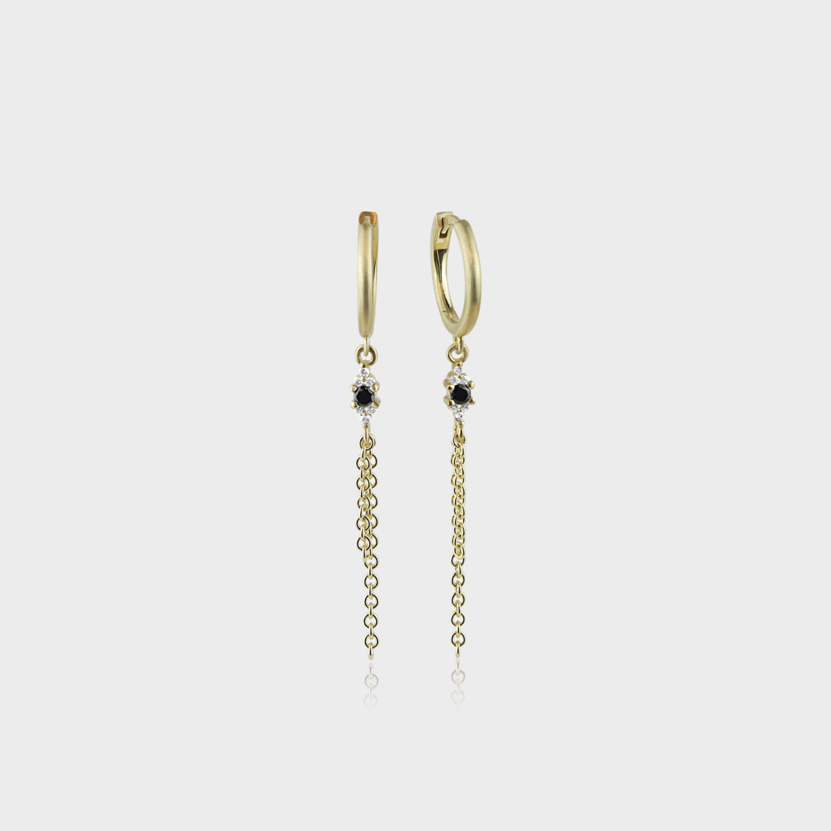 חישוקי זהב 14k עם תליונים משובצים 12 יהלומים לבנים ו 2 יהלומים שחורים במרכז ושרשראות מחוברת לתליון. יפיפים ומתאימים ליום יום ולאירועים. אמירה ייחודית עם המון שיק וסטייל.