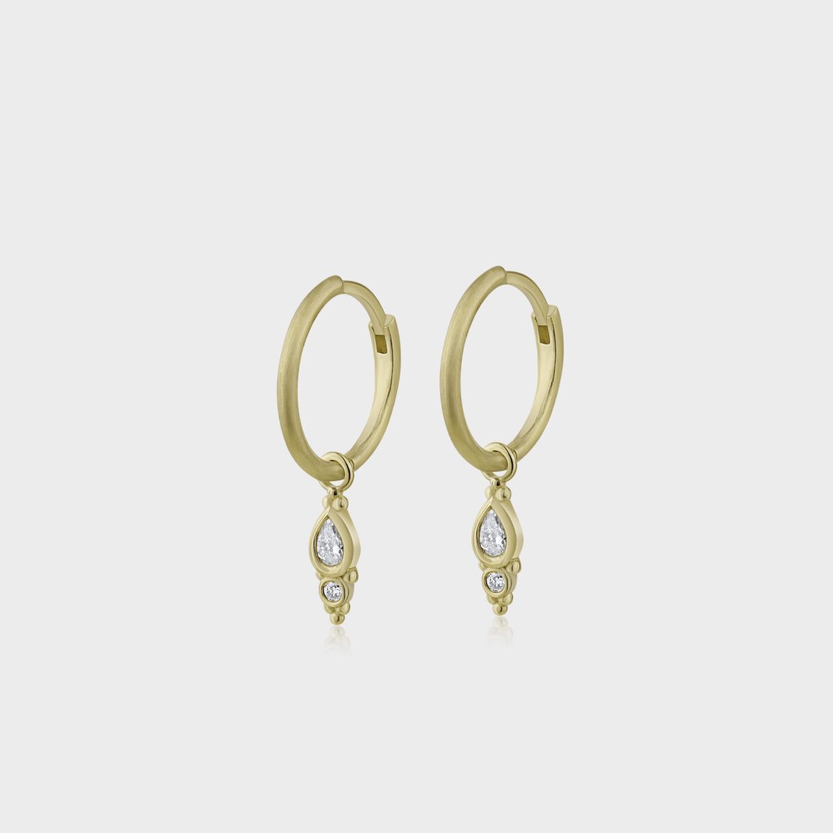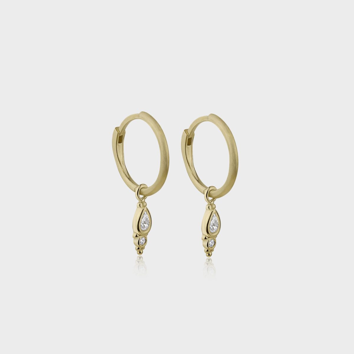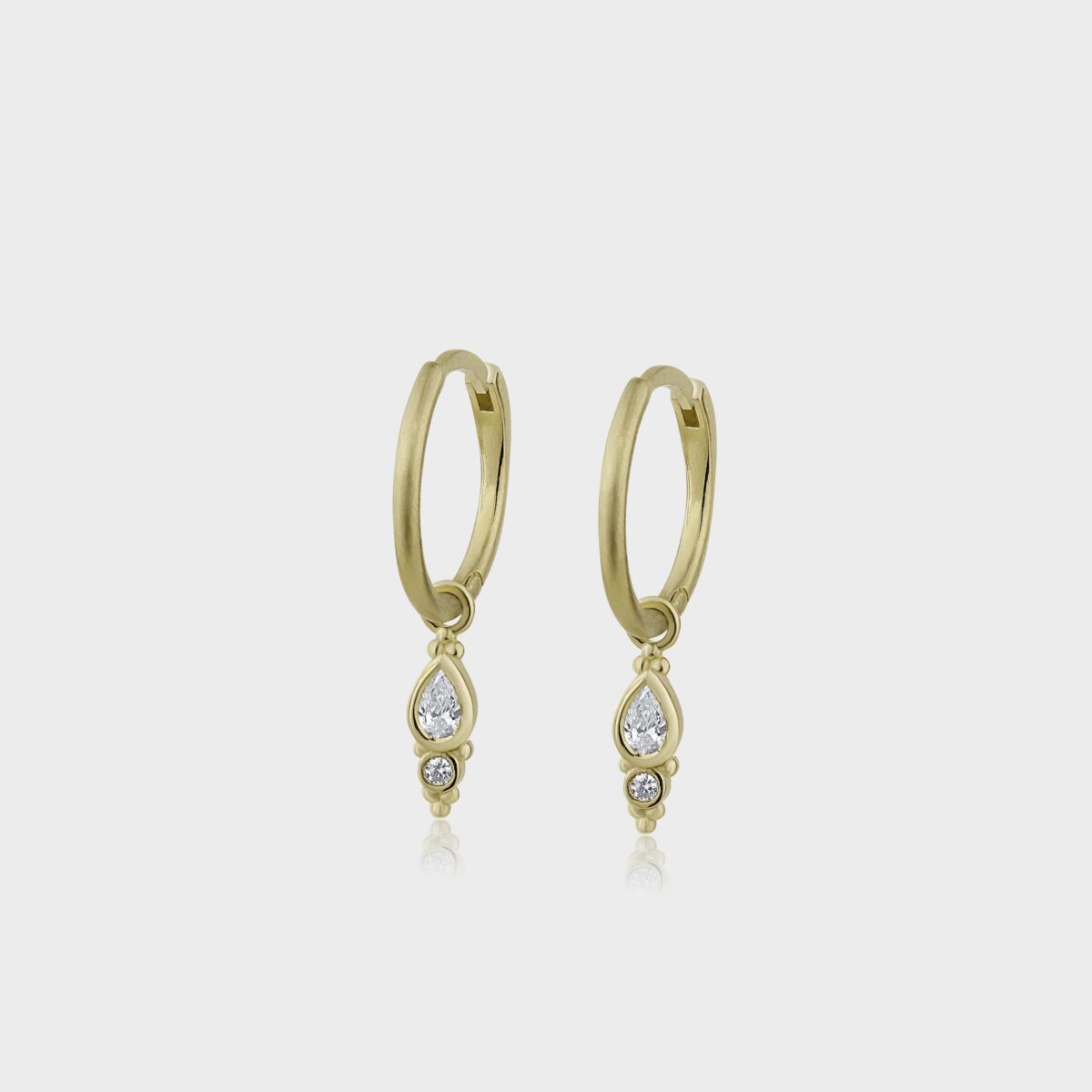 זוג חישוקי זהב 14 קרט בייסיק מהממים, שעליהם מושחל תליון בעיצוב שיקי משובץ יהלום טיפה ויהלום עגול F VS. העגילים הכי כיפים שאת יכולה לשנות לפי מצב הרוח שלך ומה שהכי מתחשק לך באותו הרגע.