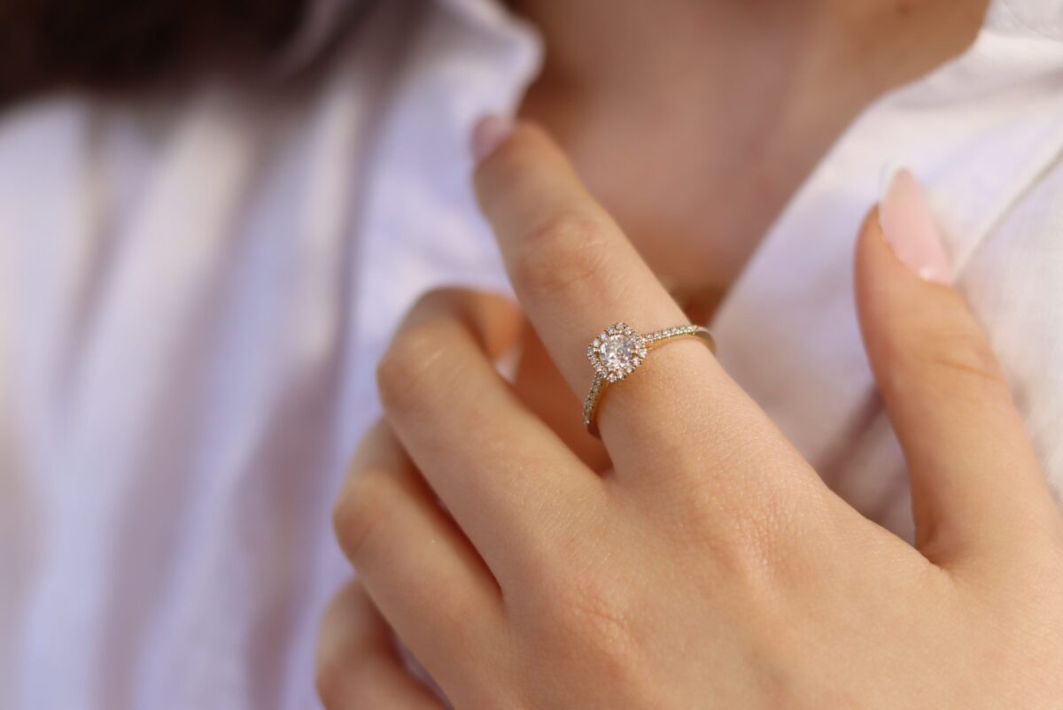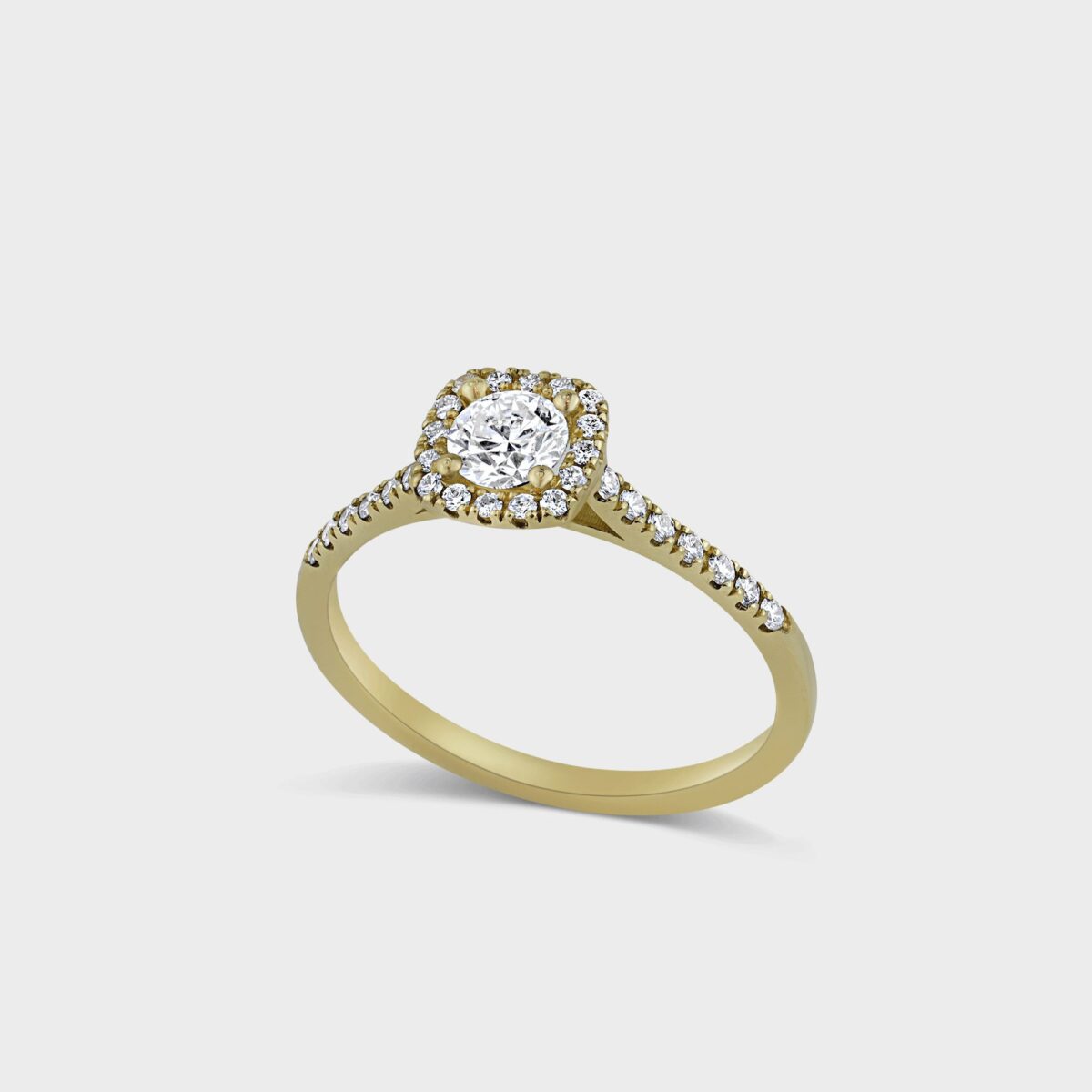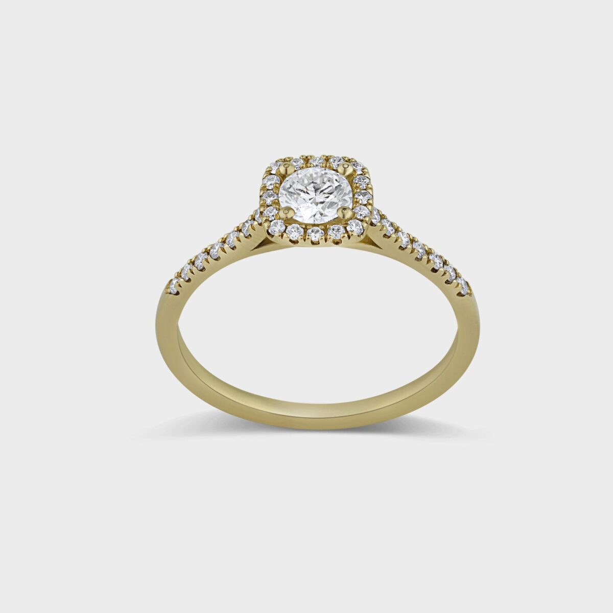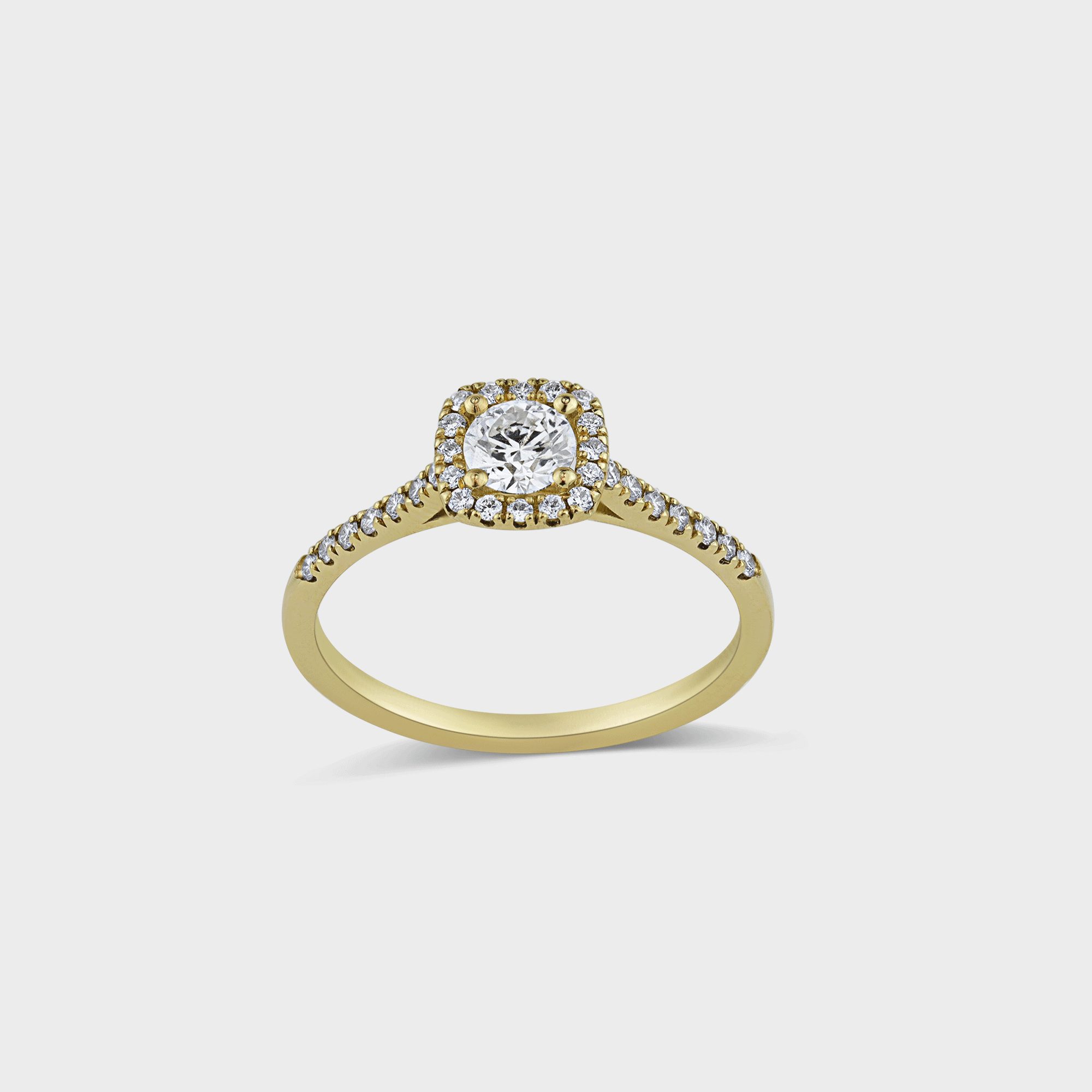 טבעת אירוסין סוליטר בזהב 14k, משובצת יהלום מרכזי במשקל 0.40 קרט (F, VS1 – GIA Certificate) שמסביבו יהלומים יפיפיים משובצים במבנה מרובע המעניק ליהלום מראה גדול יותר, ייחודי ומרשים. בצדי הטבעת משובצים 14 יהלומים במשקל של 0.14 קרט (F, VS). סביב היהלום המרכזי משובצים 16 יהלומים במשקל 0.08 קרט (F, VS). סה״כ משקל כולל של היהלומים: 0.60 קרט.