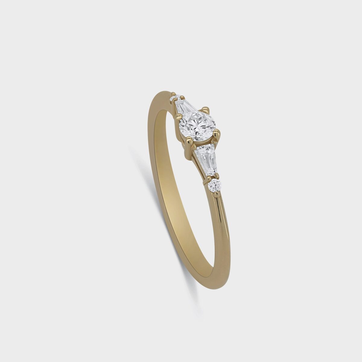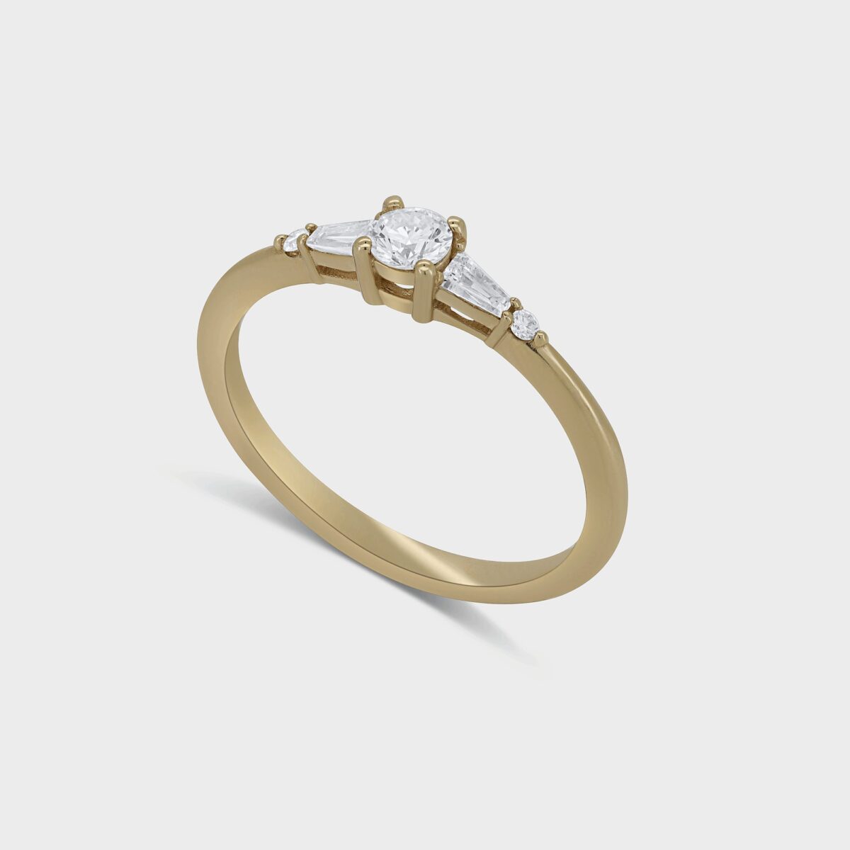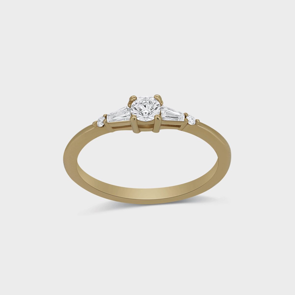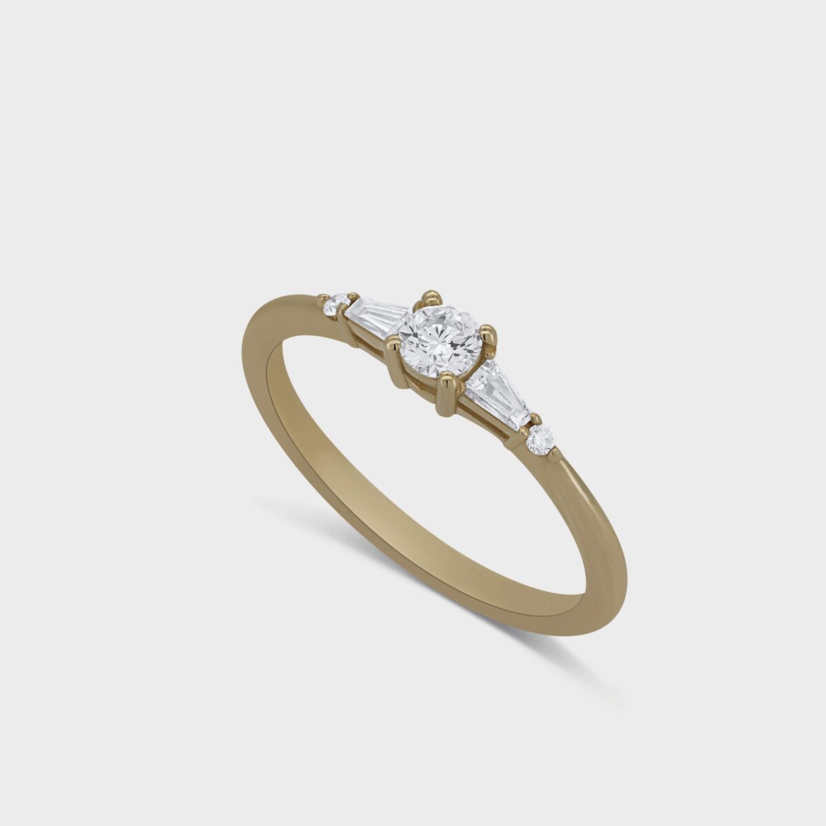 טבעת בסגנון וינטג' עשויה זהב 14 קרט, משובצת ביהלום מרכזי ומצדדיו 2 יהלומים לבנים טייפרים בחיתוך מלבני מיוחד ולידם 2 יהלומים לבנים עגולים ומנצנצים. בעלת נוכחות ומיוחדת, כל מה שאי פעם רצית בטבעת המושלמת שלך.