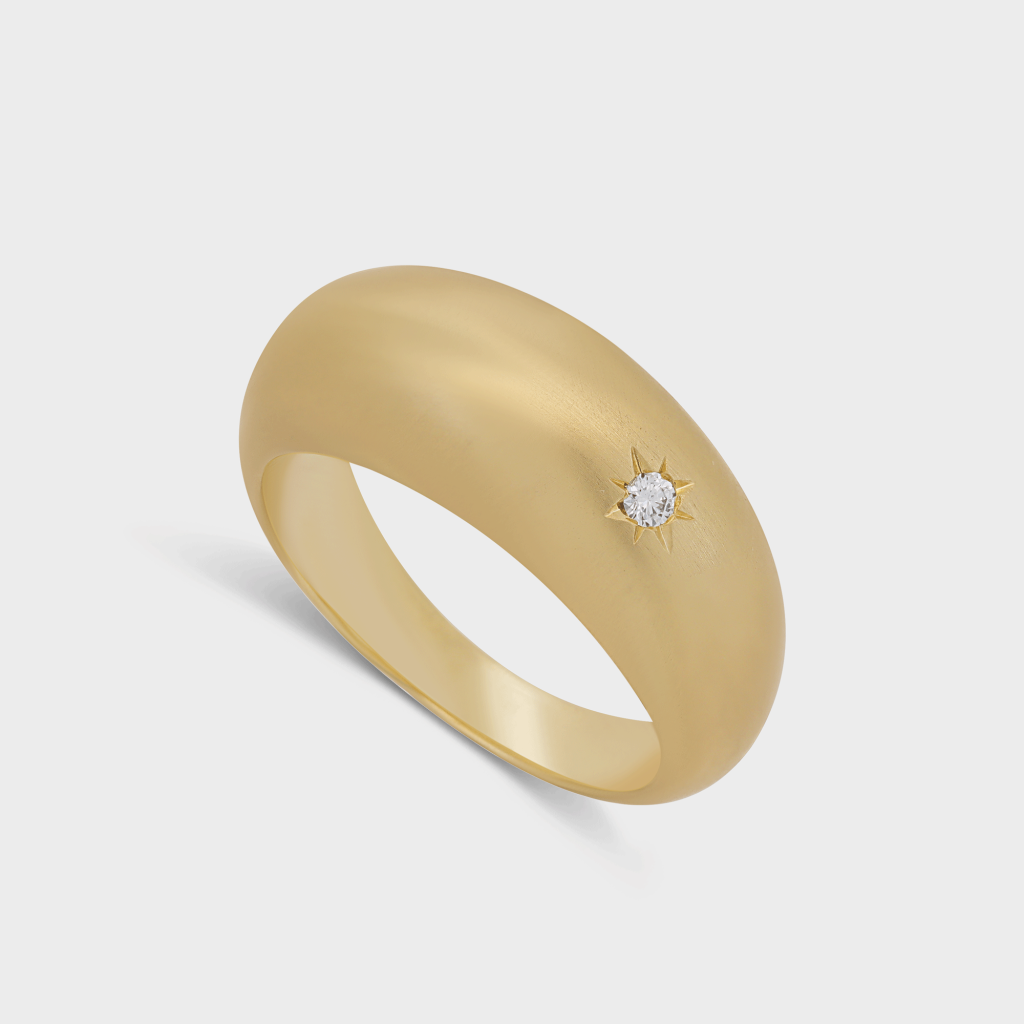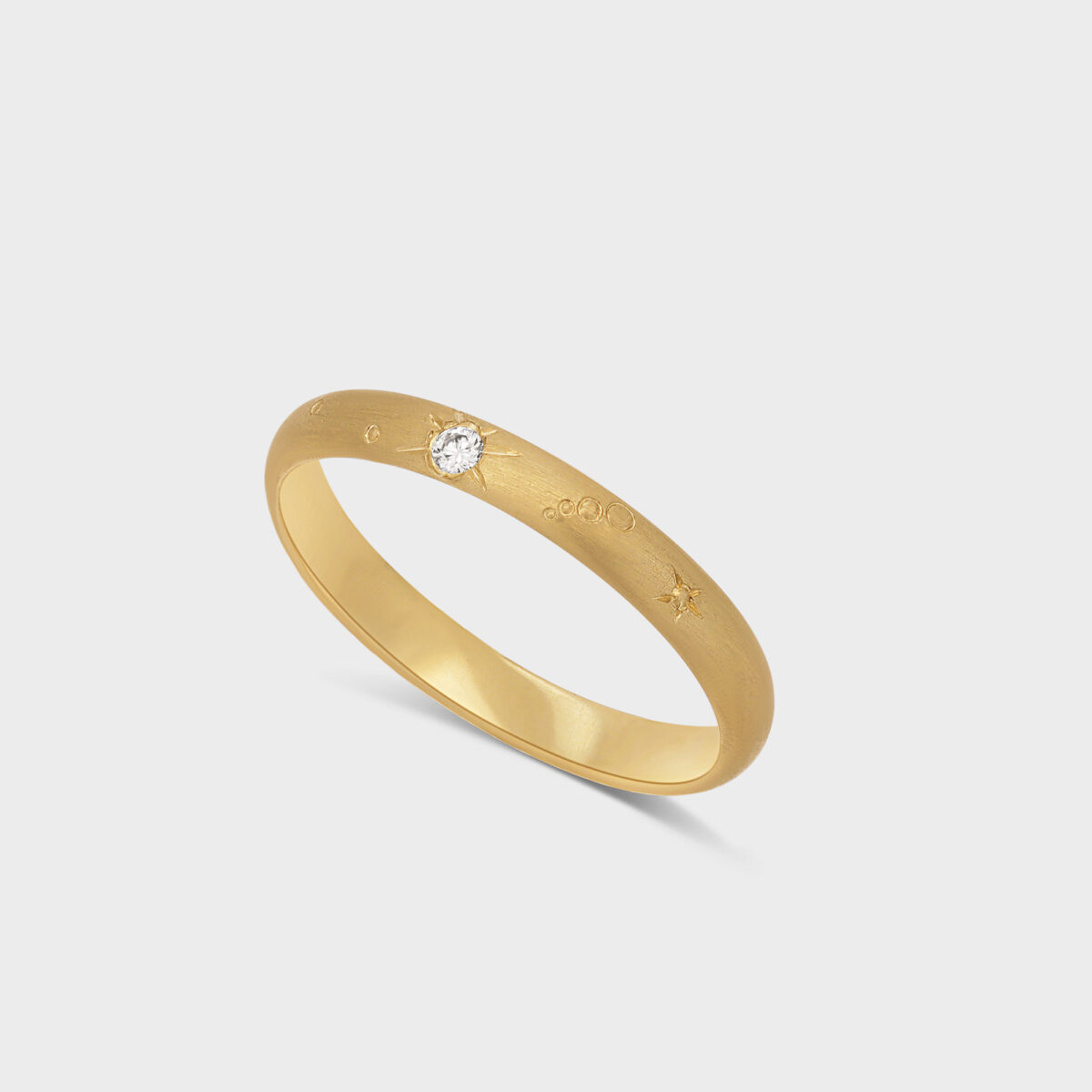 טבעת זהב משובצת יהלום עם אלמנטים של כוכבים וצורות הנעשים בעבדות יד מדוייקת ומעניקים לה מראה ייחודי.