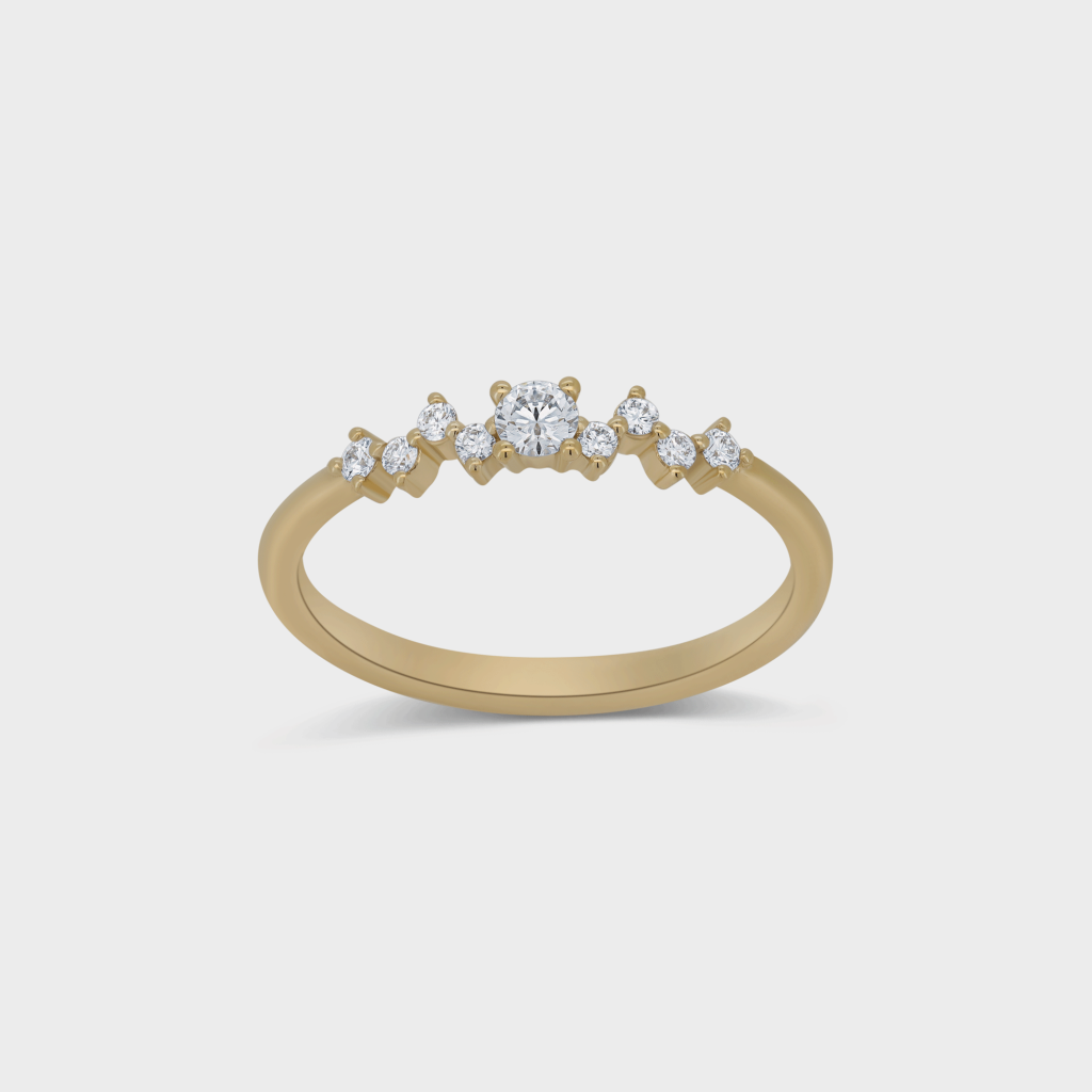 טבעת זהב משובצת יהלום עם אלמנטים של כוכבים וצורות הנעשים בעבדות יד מדוייקת ומעניקים לה מראה ייחודי.