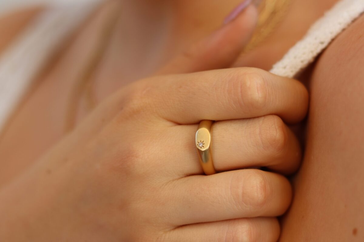 טבעת זהב 14k חותם לאישה בעלת קוים סקסים ומעוגלים. הטבעת משובצת יהלום בתוך כוכב שחצוב בזהב בעבודת יד.