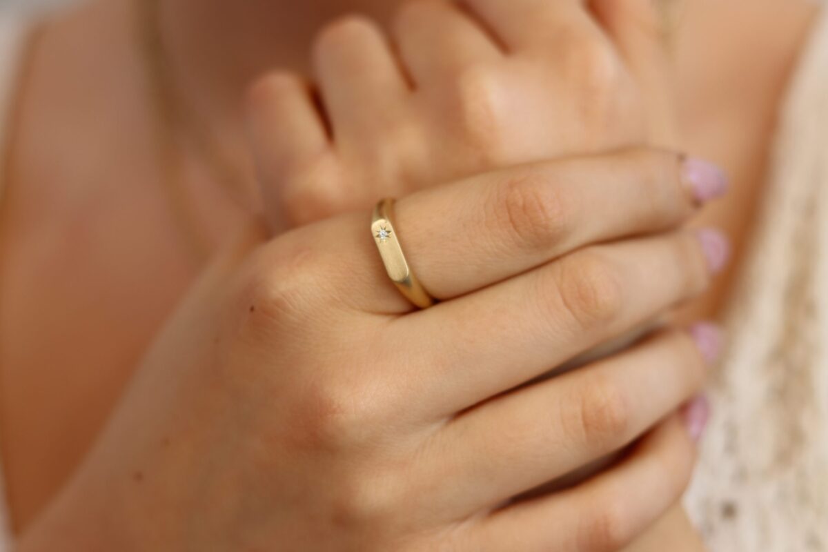 טבעת זהב 14k חותם לאישה בעלת קוים סקסים ומעוגלים. הטבעת משובצת יהלום בתוך כוכב שחצוב בזהב בעבודת יד.