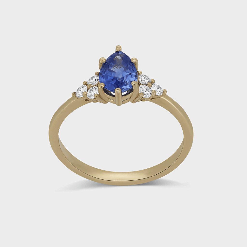 אבן חן ספיר מהממת במרכז, יהלומים סביב ועל הטבעת ומשלימות את התמונה שני אבני חן אמרלד יפיפיות. הטבעת בעלת מראה יוקרתי של פעם. שפה עיצובית שמתכתבת נפלא עם הבחירה והשילוב הייחודי של אבני החן עם היהלומים.