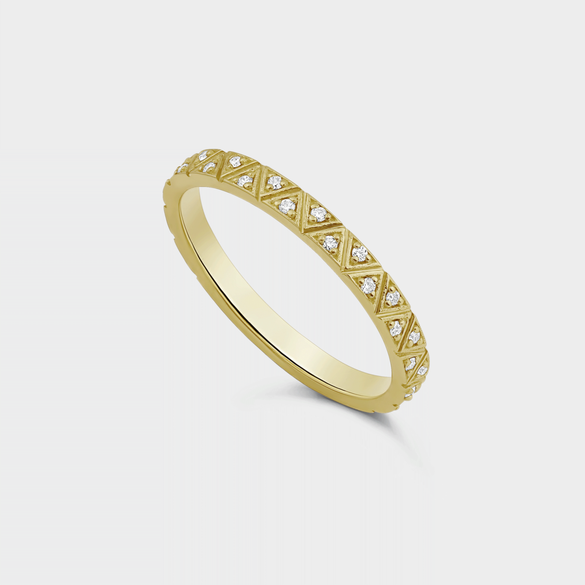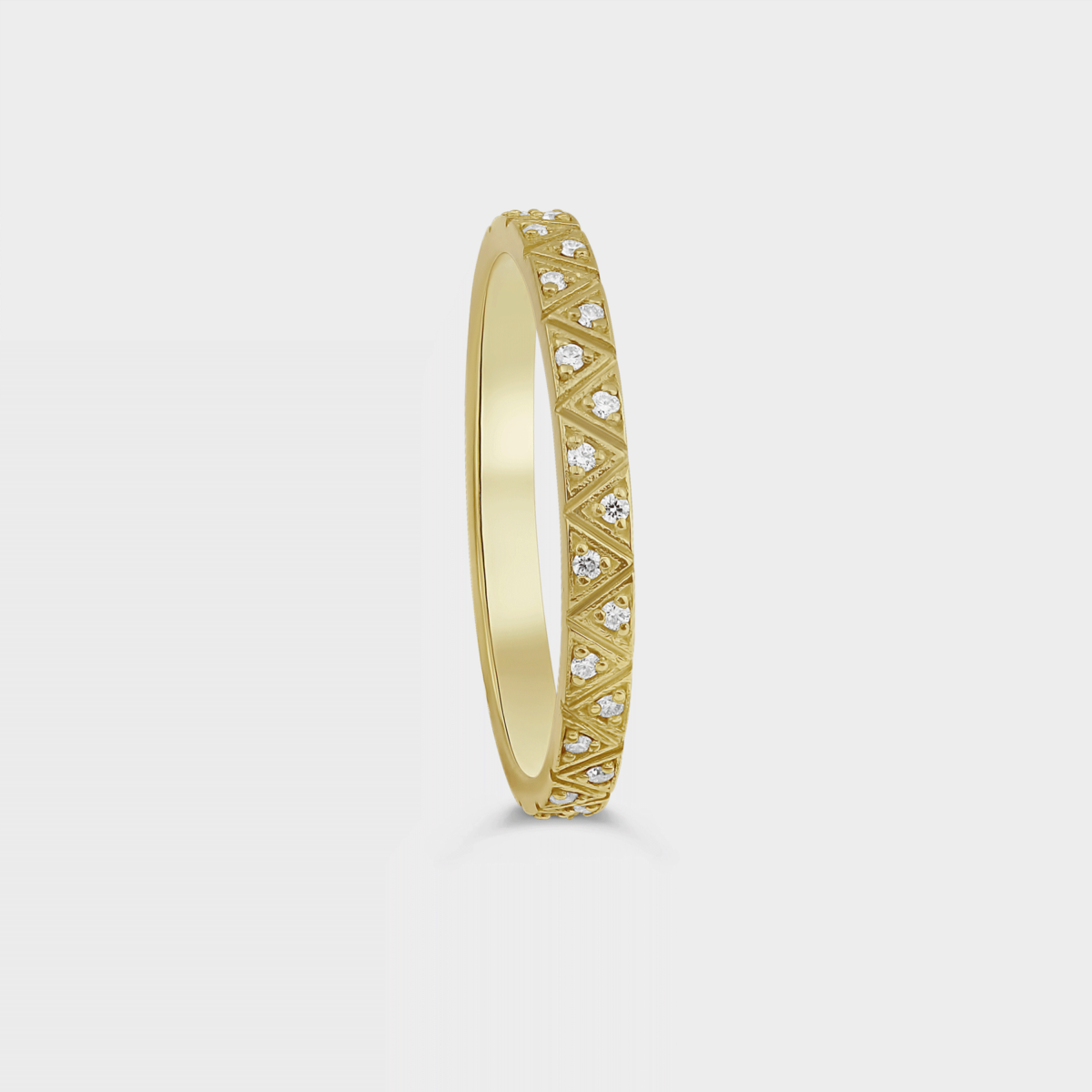 טבעת זהב 14K משובצת 36 יהלומים על כל היקפה. עיטורי משולשים בסגנון קלאסי מודרני.