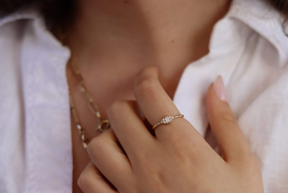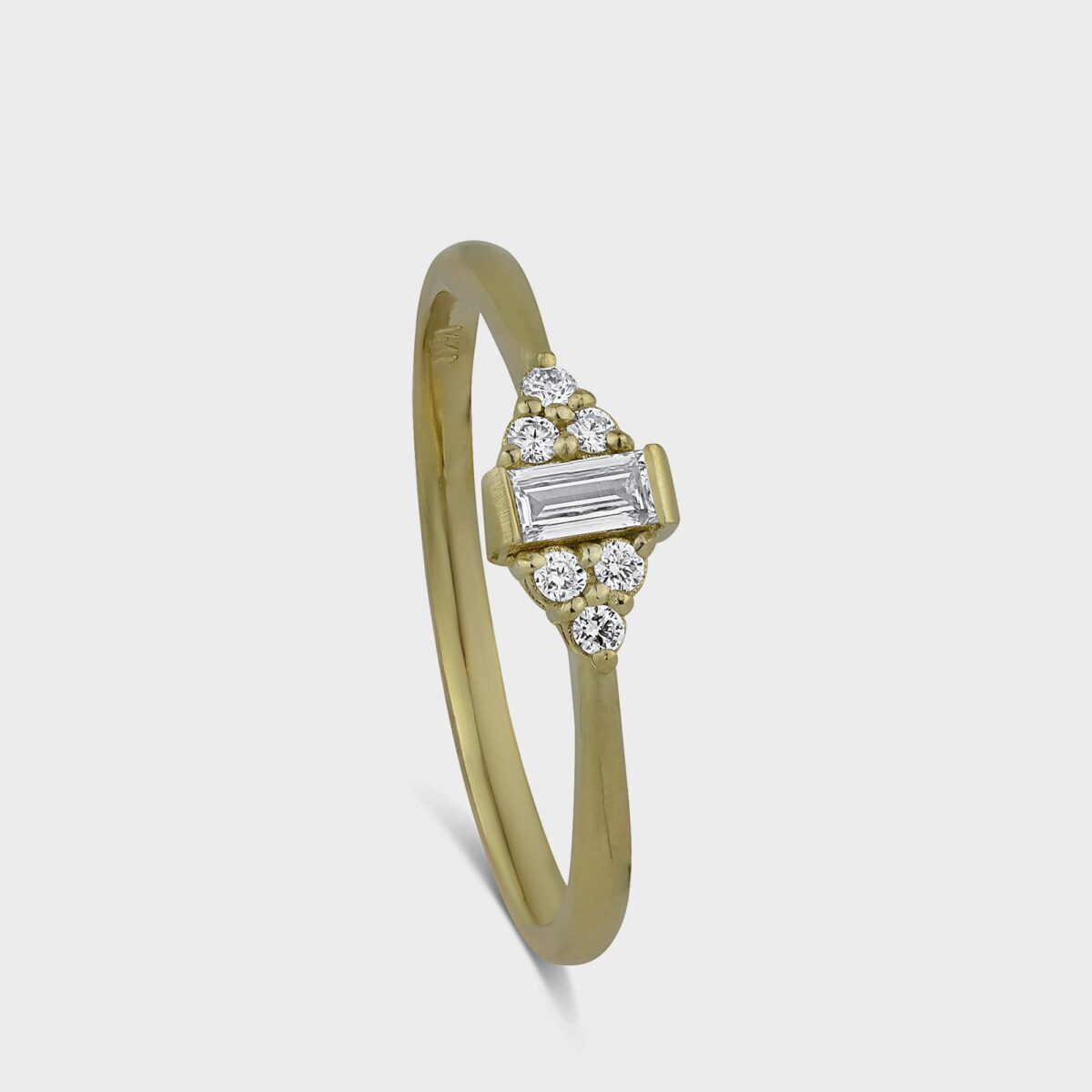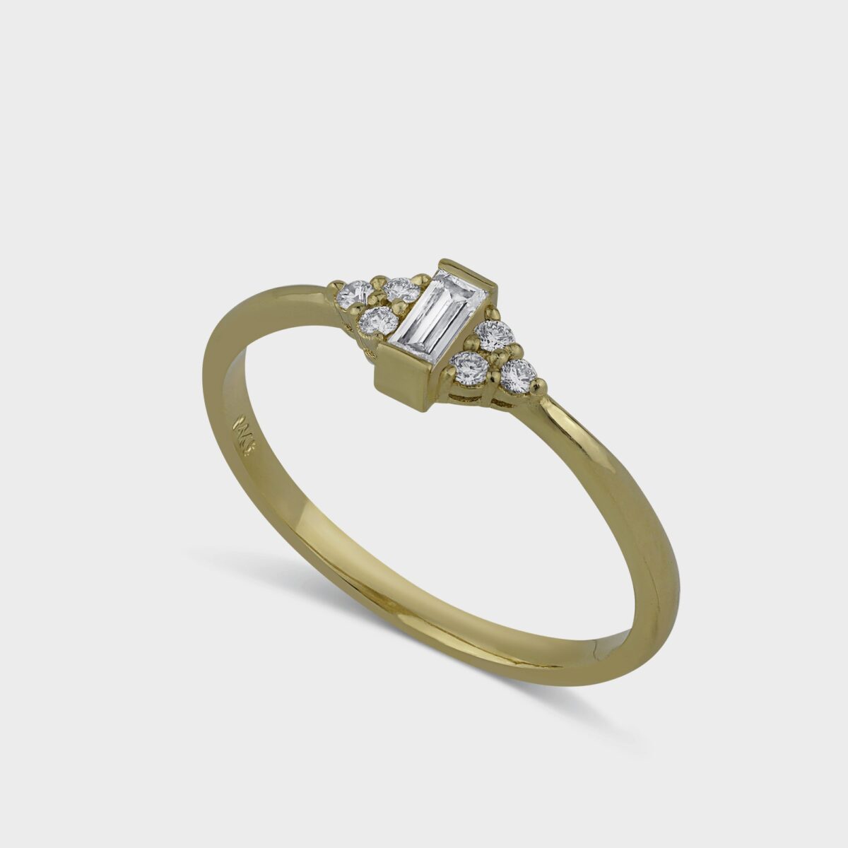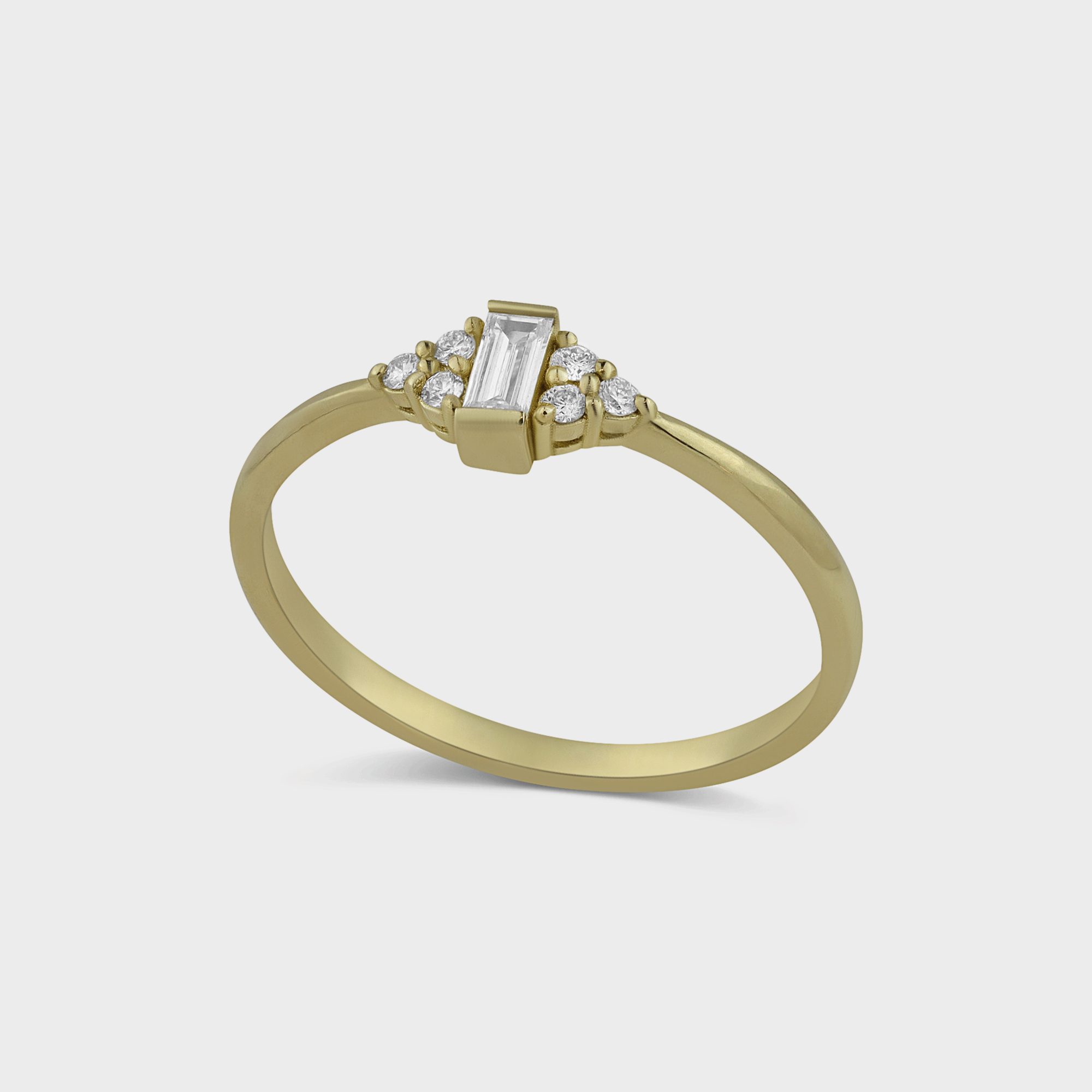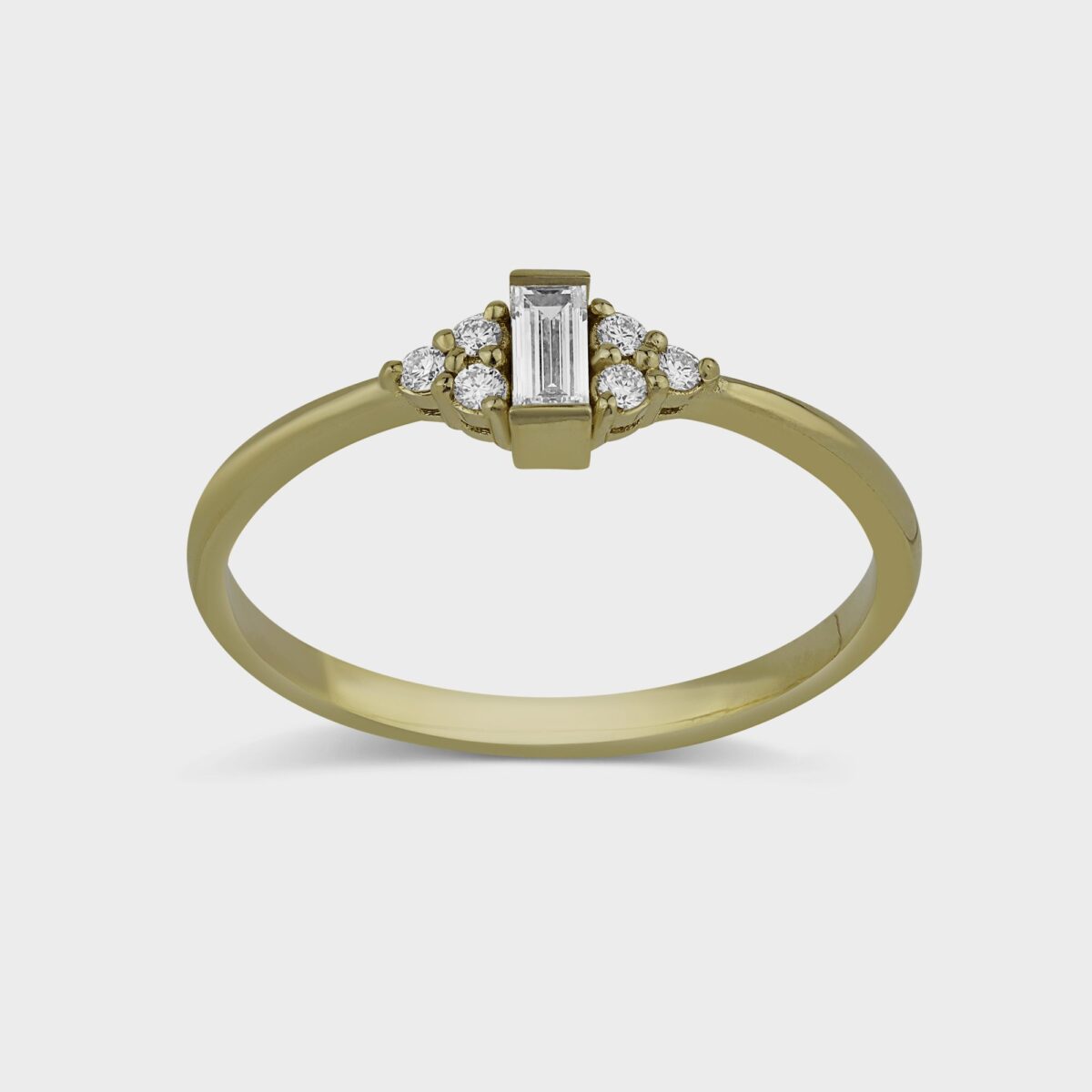 טבעת זהב 14 קרט יפייפיה ועדינה. מורכבת מיהלום מרכזי בחיתוך באגט ובצדדיו 6 יהלומים אשר מעניקים לטבעת את הצורה המיוחדת שלה.
