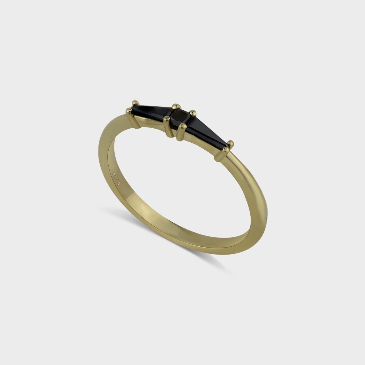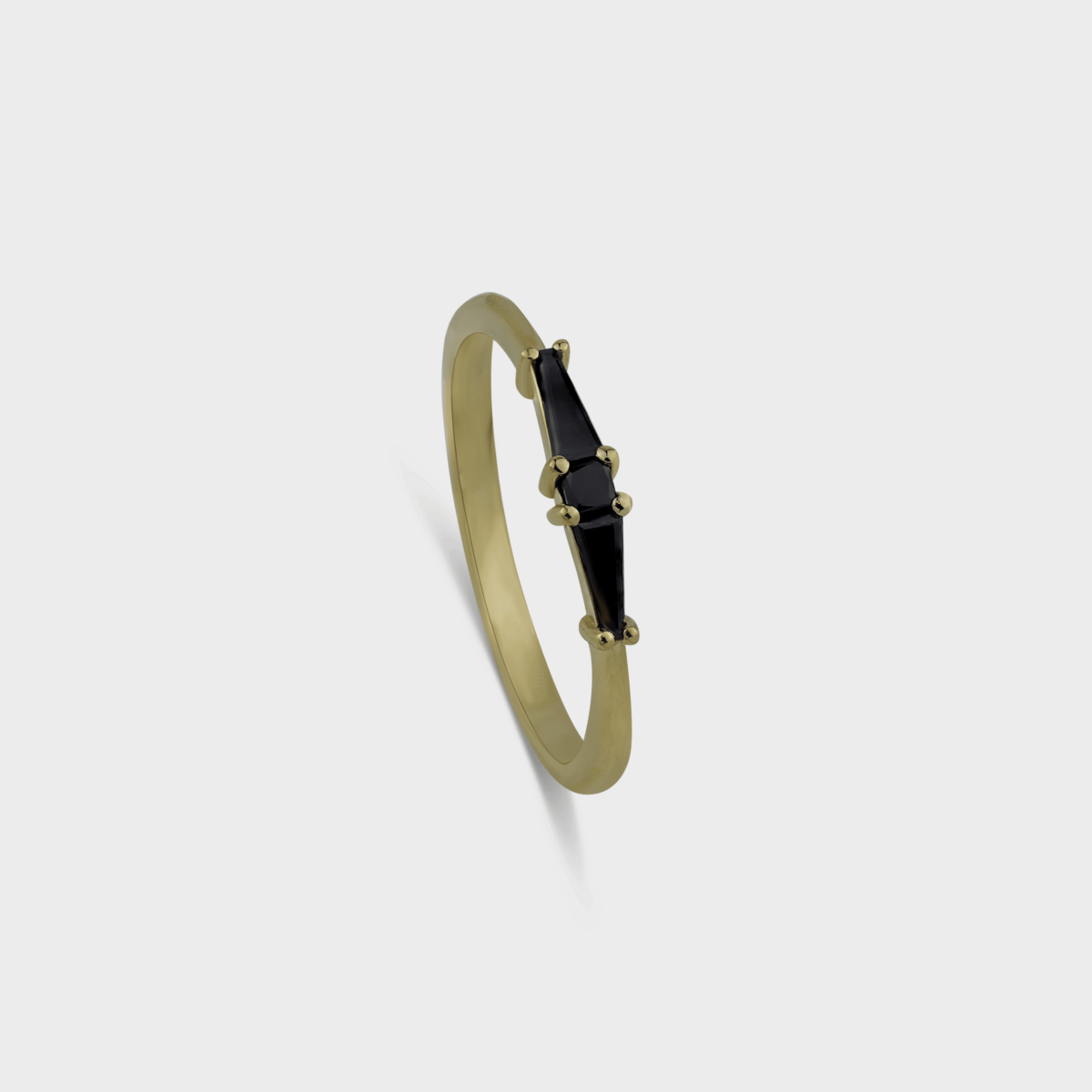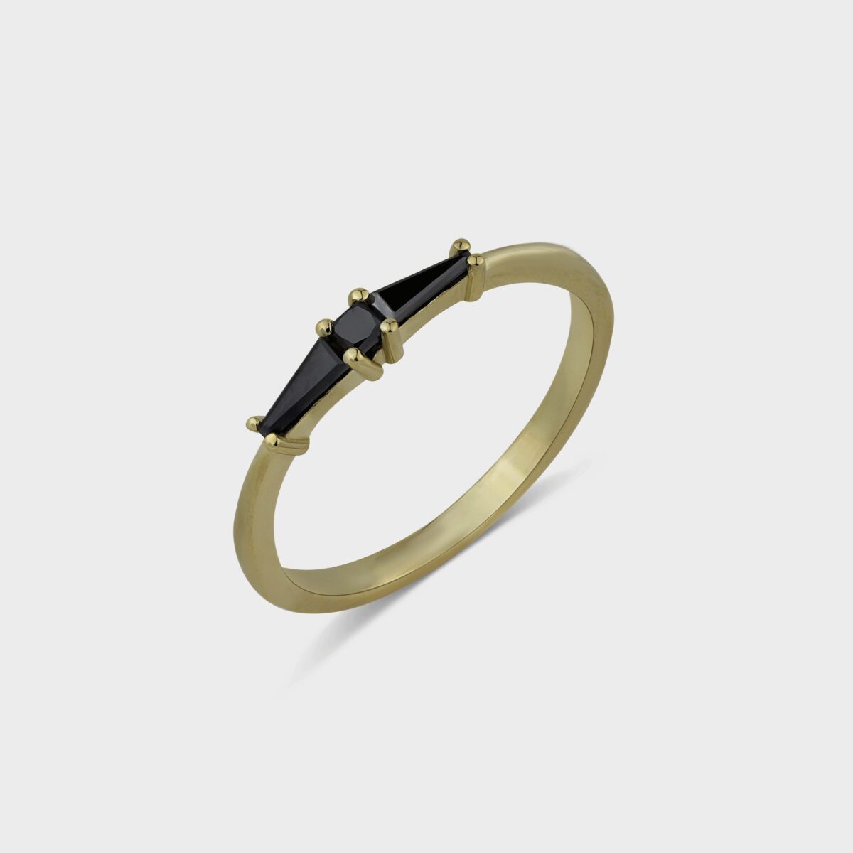 טבעת זהב 14 קרט, ייחודית ועדינה עם יהלום פרינסס מרכזי ושני יהלומים שחורים טייפרים בצדדים. טבעת מלאת נוכחות שתסתדר מצויין לבד וגם תשתלב נהדר עם טבעות נוספות.