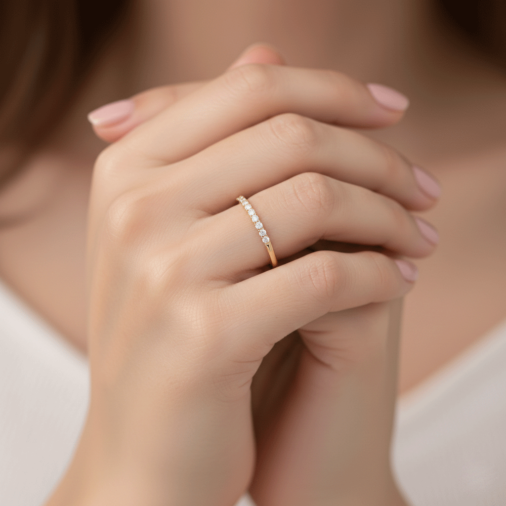 טבעת זהב 14k מעוצבת משובצת 20 יהלומים לבנים F VS על חצי היקף במשקל כולל של 0.20 קרט. ניצנוץ יהלומים שמושך את העיניים, זה כל ההבדל.