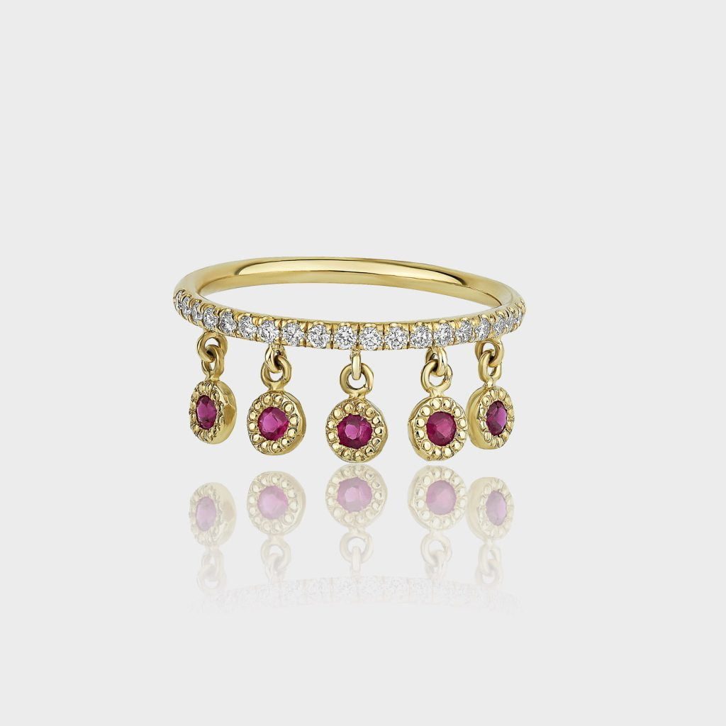 טבעת זהב 14K יהלומים ורובי מתנדנדים