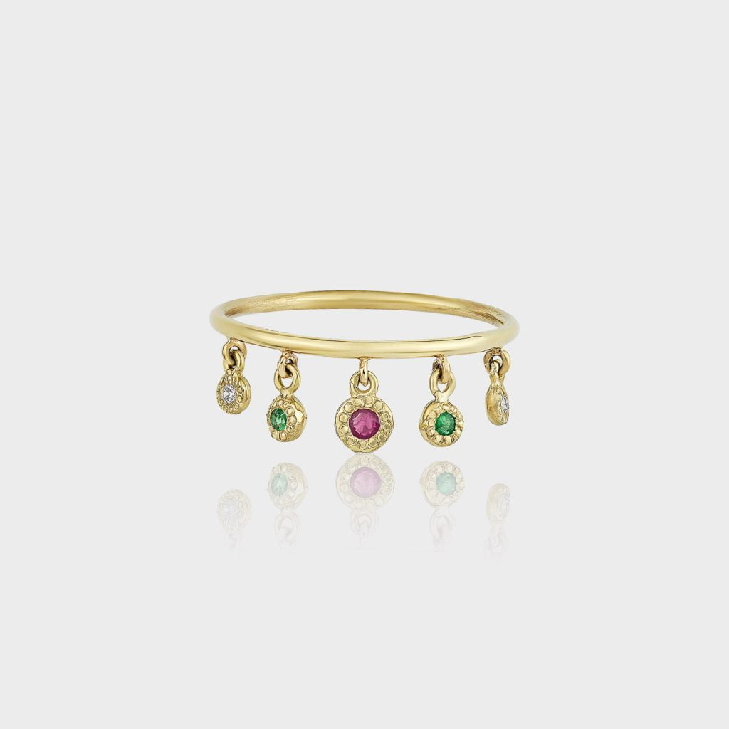 טבעת זהב 14K, מיוחדת שתסובב ראשים. הטבעת משובצת אבני חן רובי אדומים במשקל כולל של 0.20 קרט. ממנה תלויים חמישה עיגולי זהב משובצים ביהלומים מנצנצים במשקל כולל של 0.075 קרט F VS. למראה מיוחד במינו, כזה שיגרום לך לבלוט.