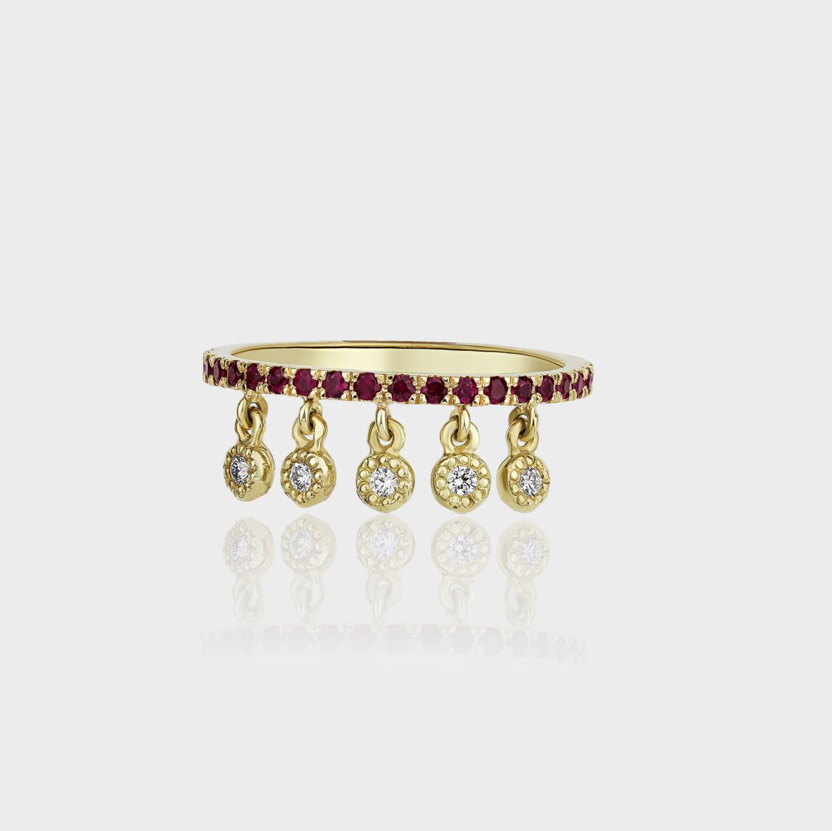 טבעת זהב 14K, מיוחדת שתסובב ראשים. הטבעת משובצת אבני חן רובי אדומים במשקל כולל של 0.20 קרט. ממנה תלויים חמישה עיגולי זהב משובצים ביהלומים מנצנצים במשקל כולל של 0.075 קרט F VS. למראה מיוחד במינו, כזה שיגרום לך לבלוט.