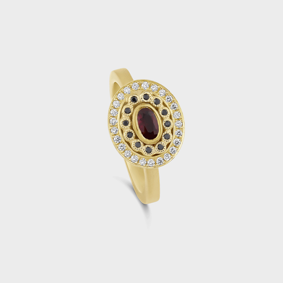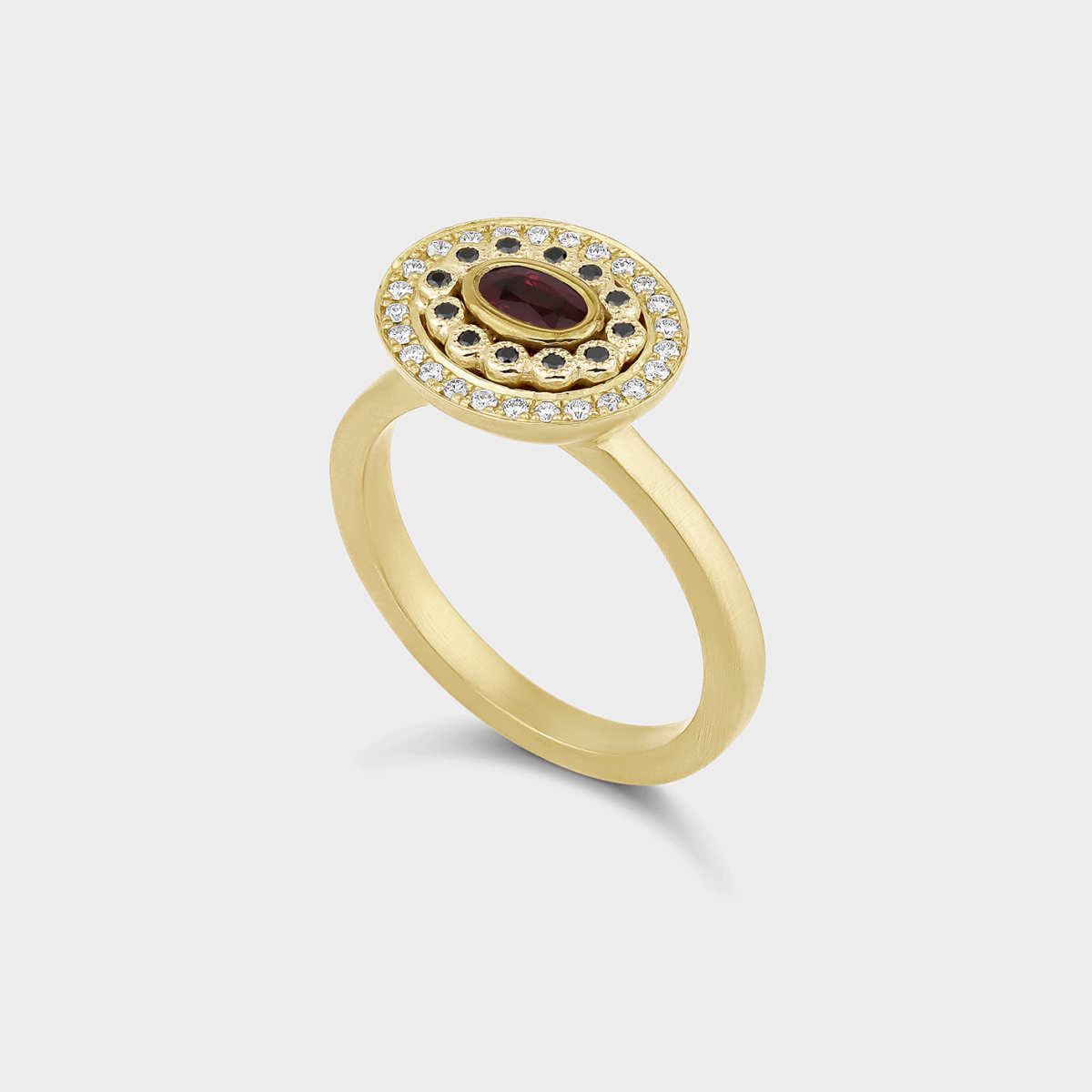 נדירה ביופיה, מעוצבת עד לפרט הכי קטן. ייחודית ומרשימה. במרכז אבן חן רובי טבעית מעוטרת יהלומים לבנים ויהלומים שחורים.