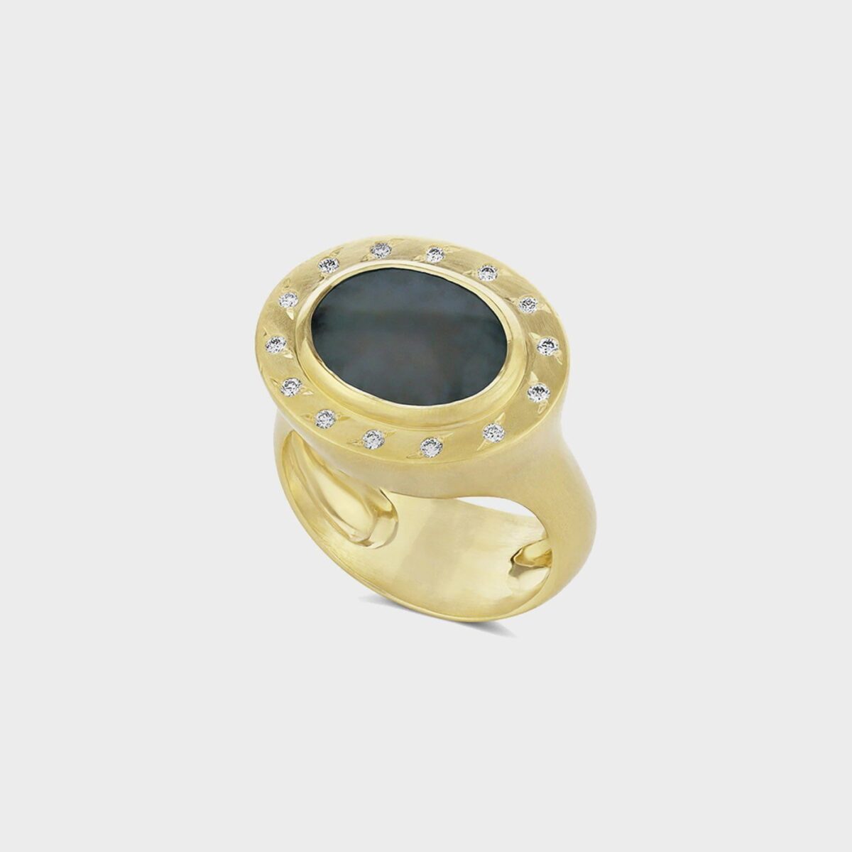 טבעת זהב 18k וינטג׳ משובצת יהלומים איכותיים F VS במשקל כולל של 0.14 קרט ובמרכזה אבן חן גלולייט מרהיבה. הטבעת מביעה אמירה נושנה בשילוב של קו מודרני אלגנטי.