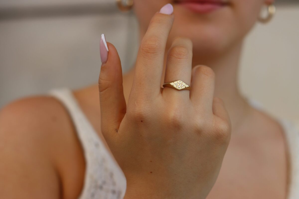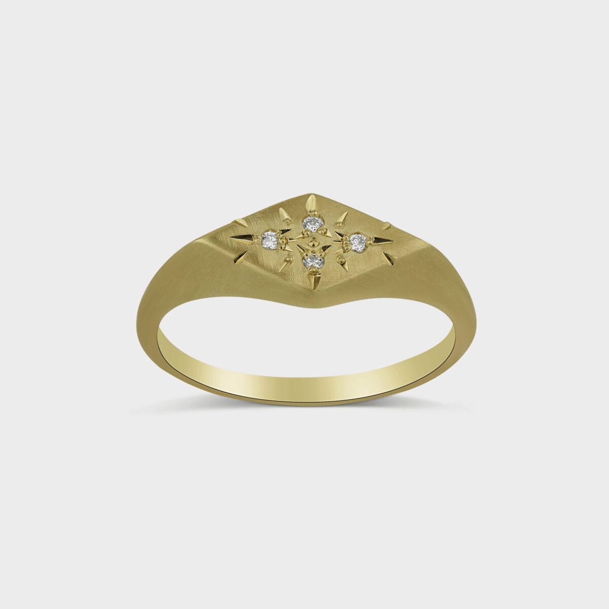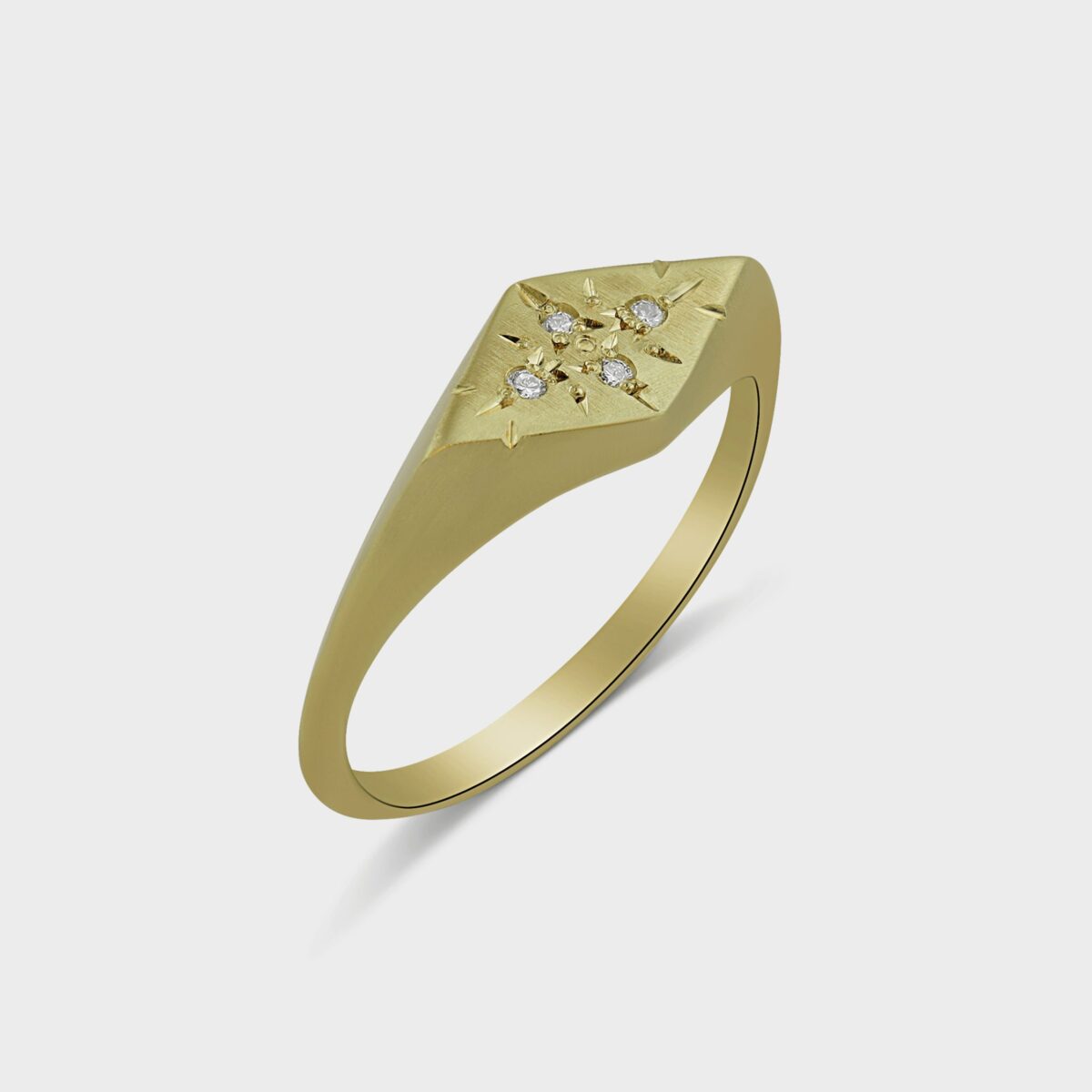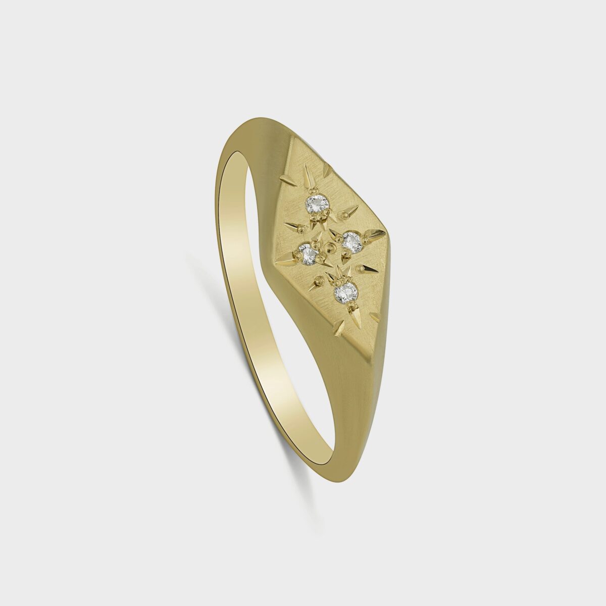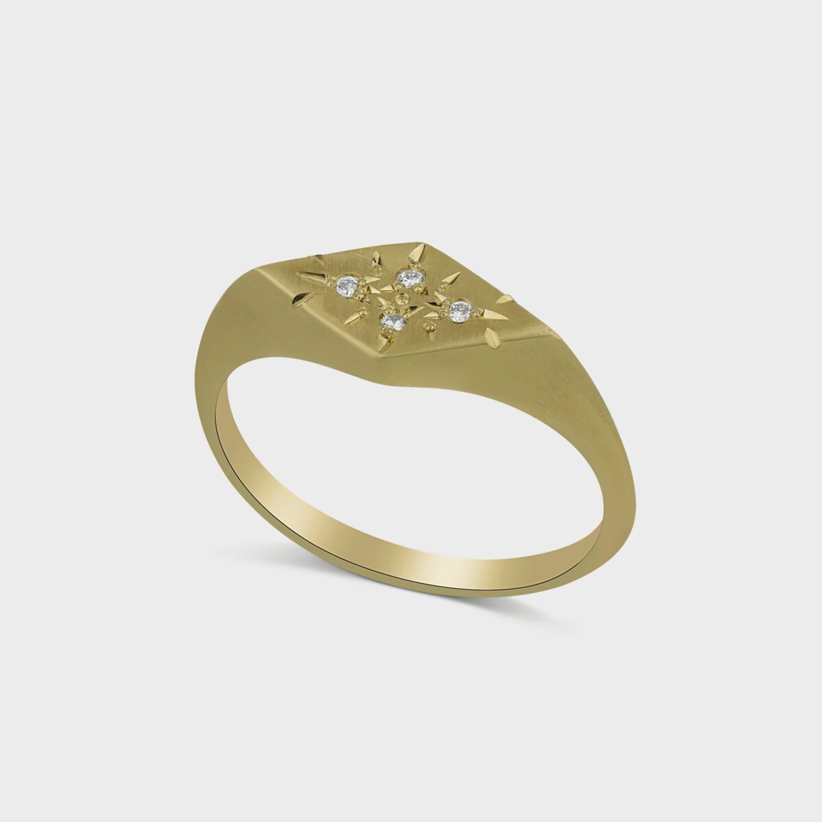 טבעת חותם זהב 14K על זמנית, מאסטרפיס משובצת ארבעה יהלומים בטכניקת שיבוץ מיוחדת ומעניינת. טבעת שיקית שתרגש אותך כל בוקר מחדש.