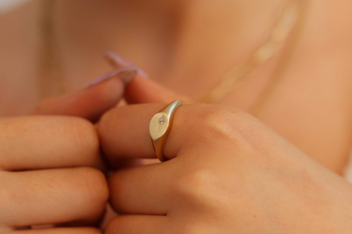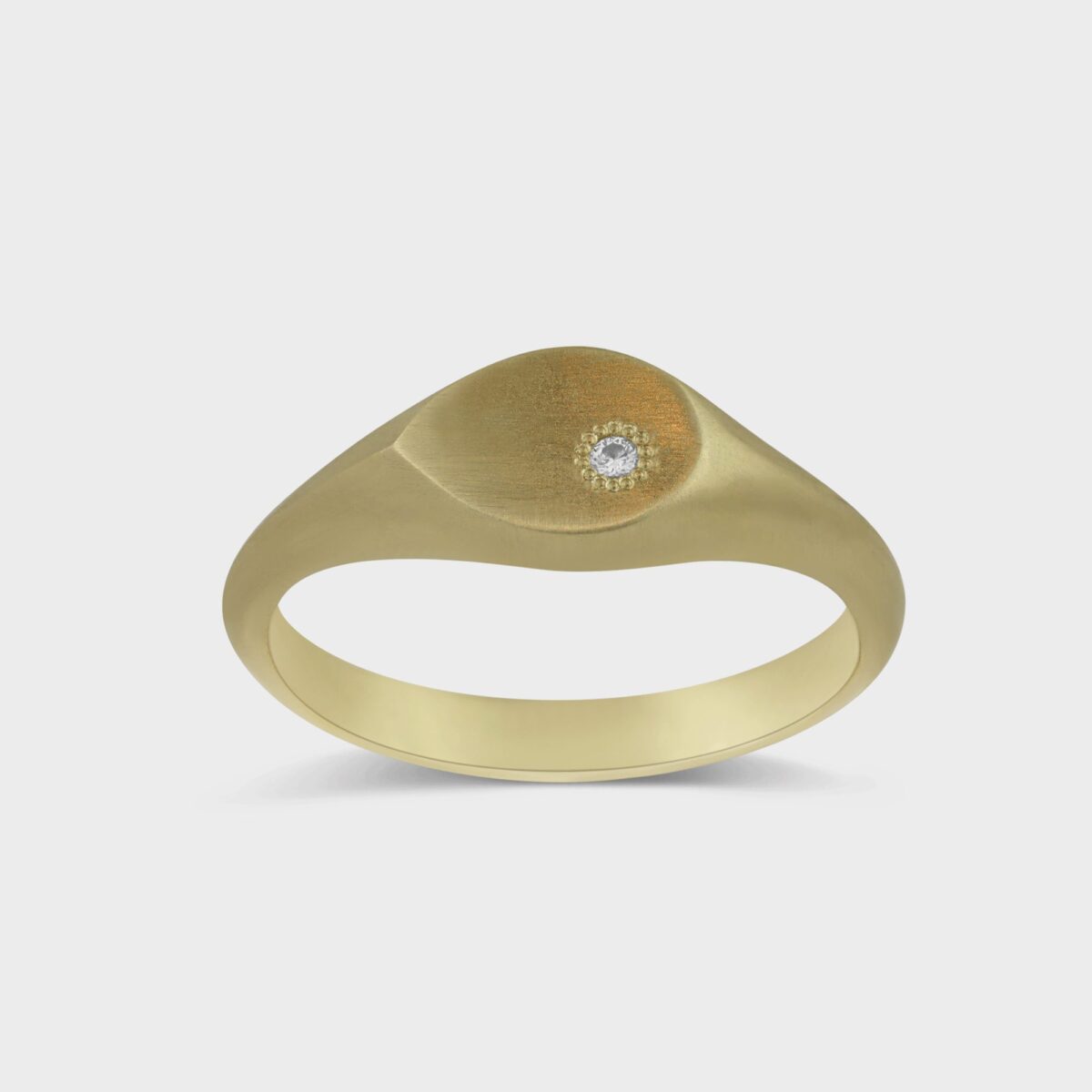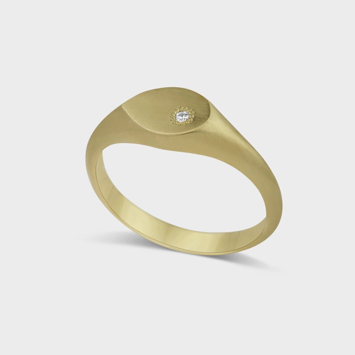 טבעת חותם עשויה 14 קרט בעלת קו נקי וקלאסי משובצת יהלום עדין בפינה וסביבו עיטורים בסגנון וינטג' מודרני בעבודת יד.
