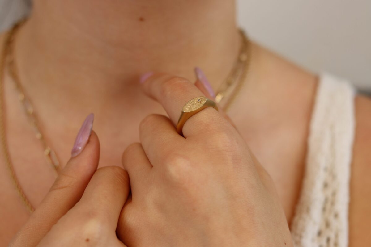 טבעת זהב 14k חותם לאישה בעלת קו נקי וקלאסי עם טקסטורה ייחודית שמכניסה הרבה אופי. הטבעת משובצת יהלום בתוך כוכב שנחצב בזהב בעבודת יד.
