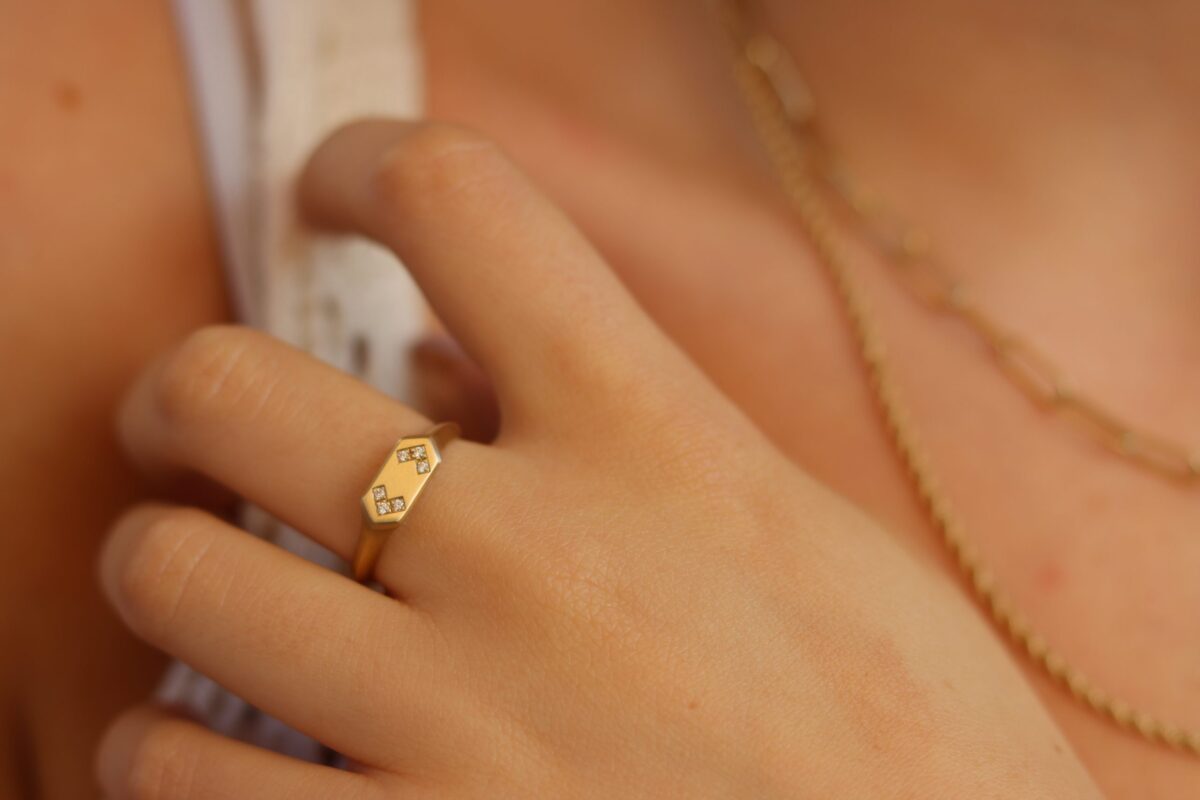 טבעת חותם עשויה זהב 14 קרט משובצת 6 יהלומים לבנים משובצים בצורת 2 חצים המעניקים לטבעת את המראה הייחודי והיפיפייה שלה.