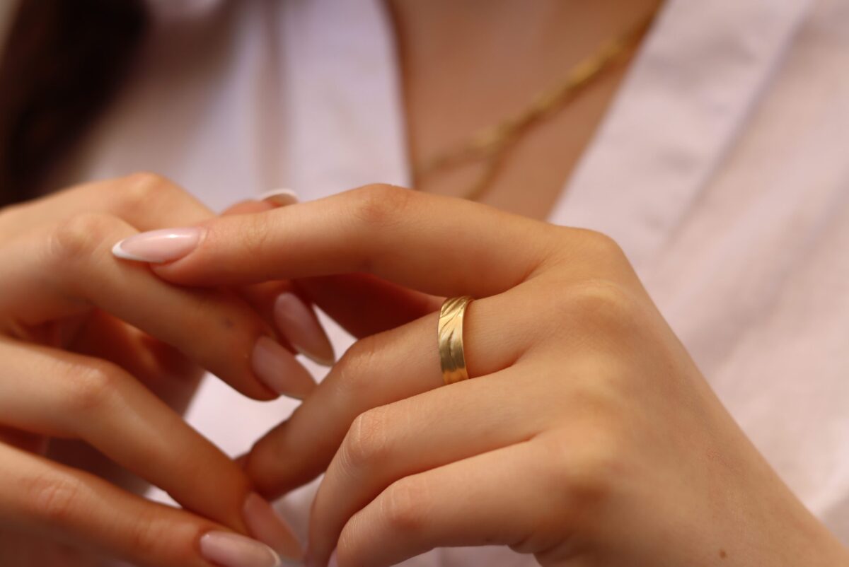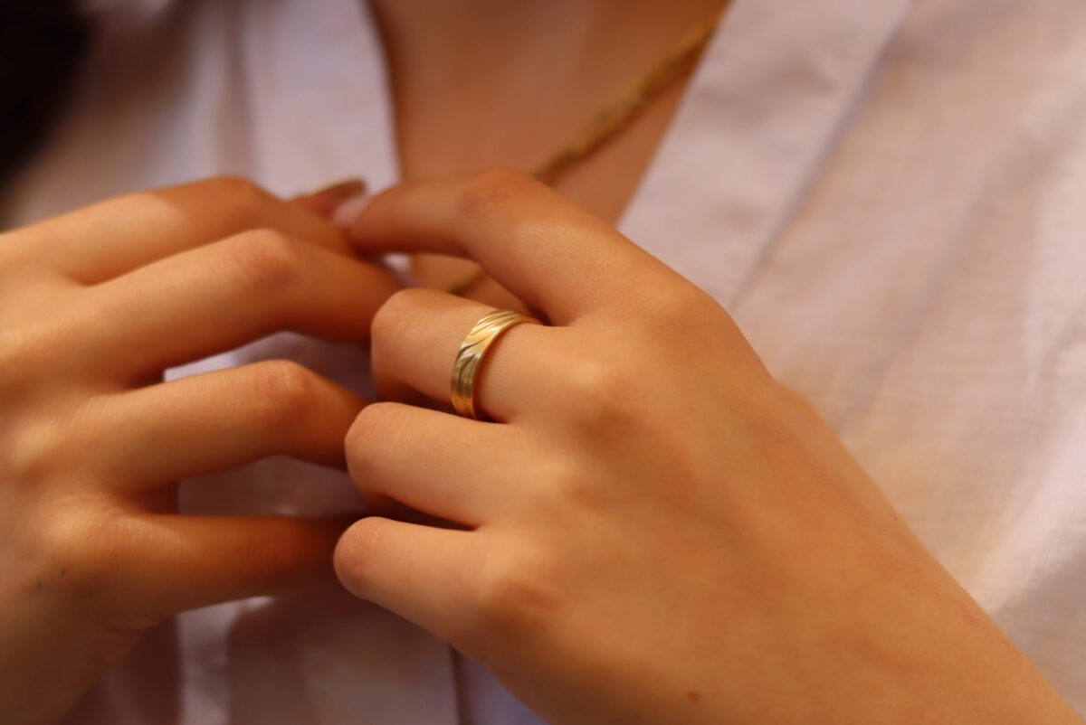 טבעת נישואין עבודת יד מזהב 14k. טבעת מעוצבת בקו גלי אלגנטי וניצחי.
