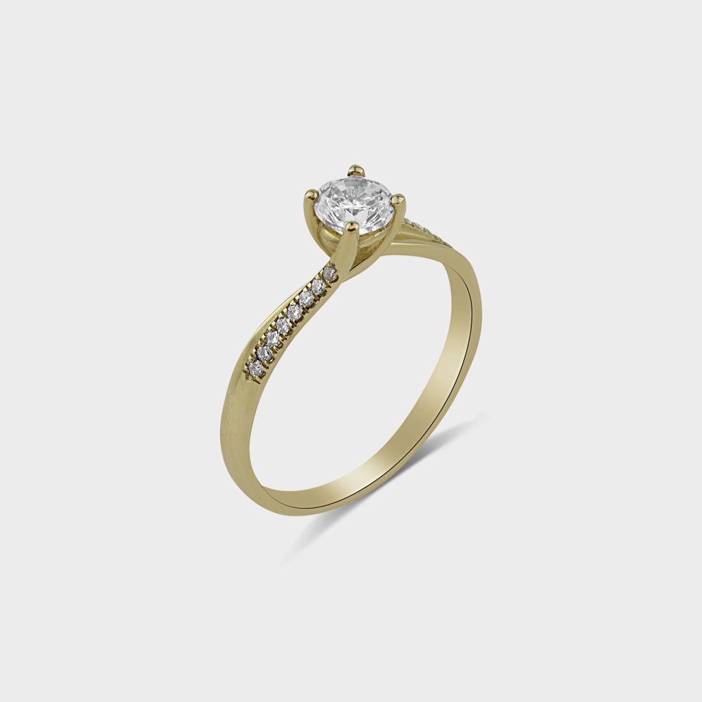 טבעת אירוסין סוליטר בזהב 14k, משובצת יהלום מרכזי במשקל 0.50 קרט (F, VS – GIA Certificate) שאותו מחזיקות 8 שני זהב יפיפיות שמוסיפות טוויסט לעיצוב הקלאסי. בכל צד משובצים שלושה יהלומים יפיפיים במבנה ייחודי ומרשים.