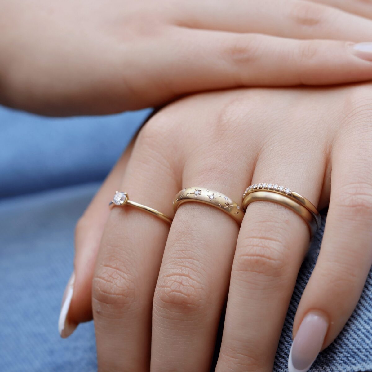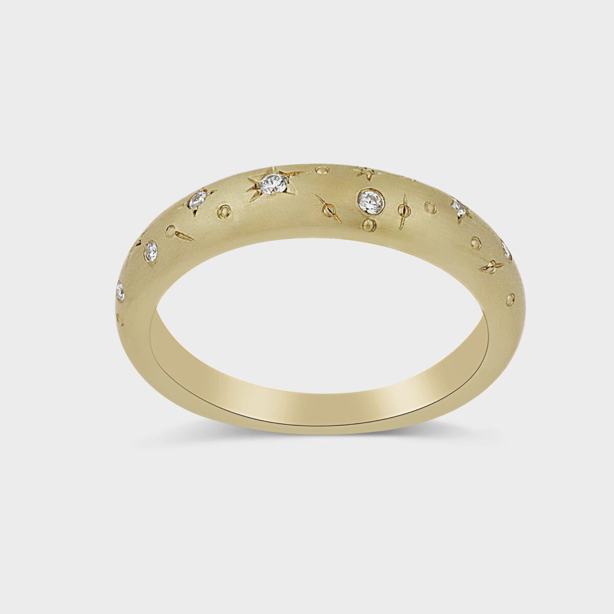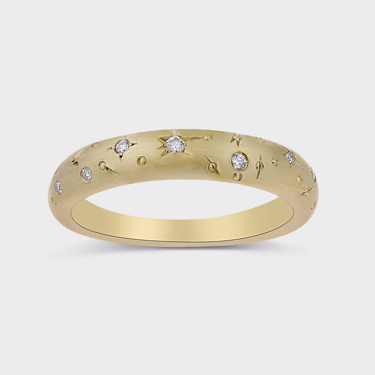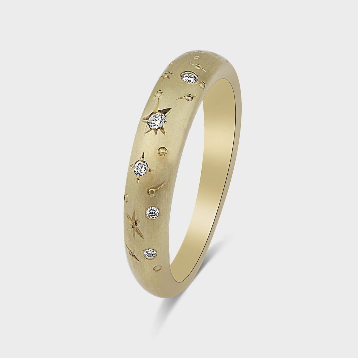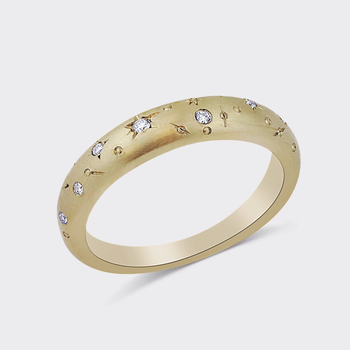 7 יהלומים מנצנצים משובצים בצורה "מבולגנת" ולא סימטרית ולמרות זאת הניצנוץ מעניק לטבעת ערך ויוקרה של תכשיט מהשורה הראשונה.