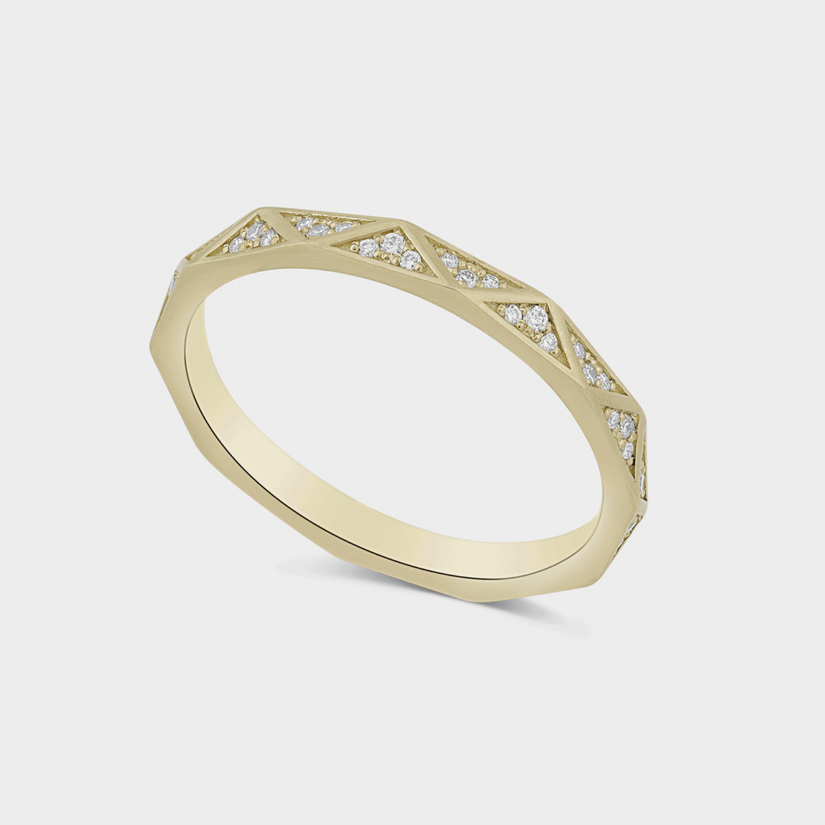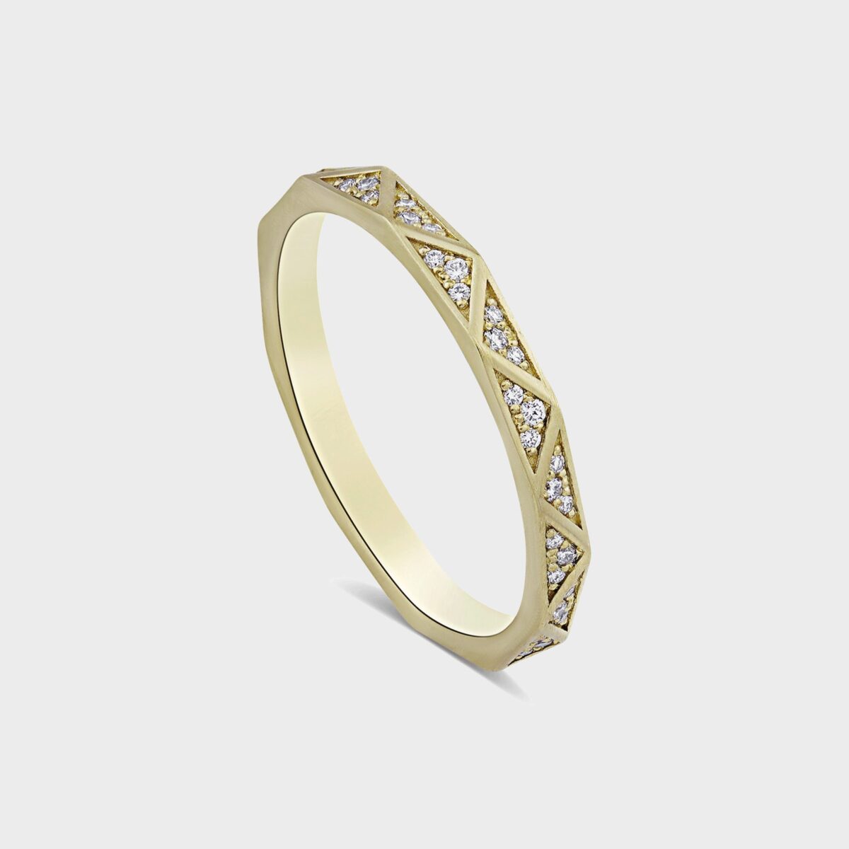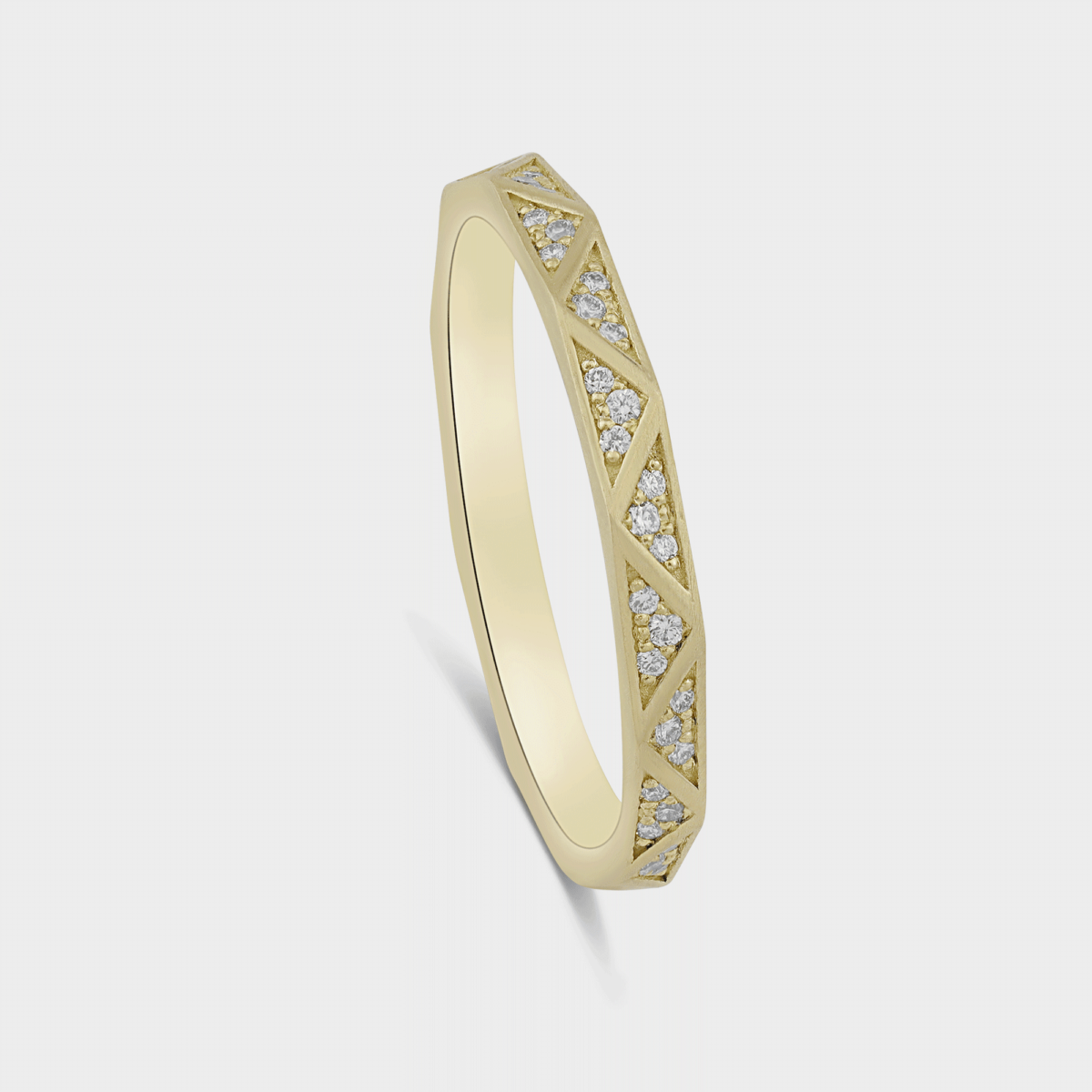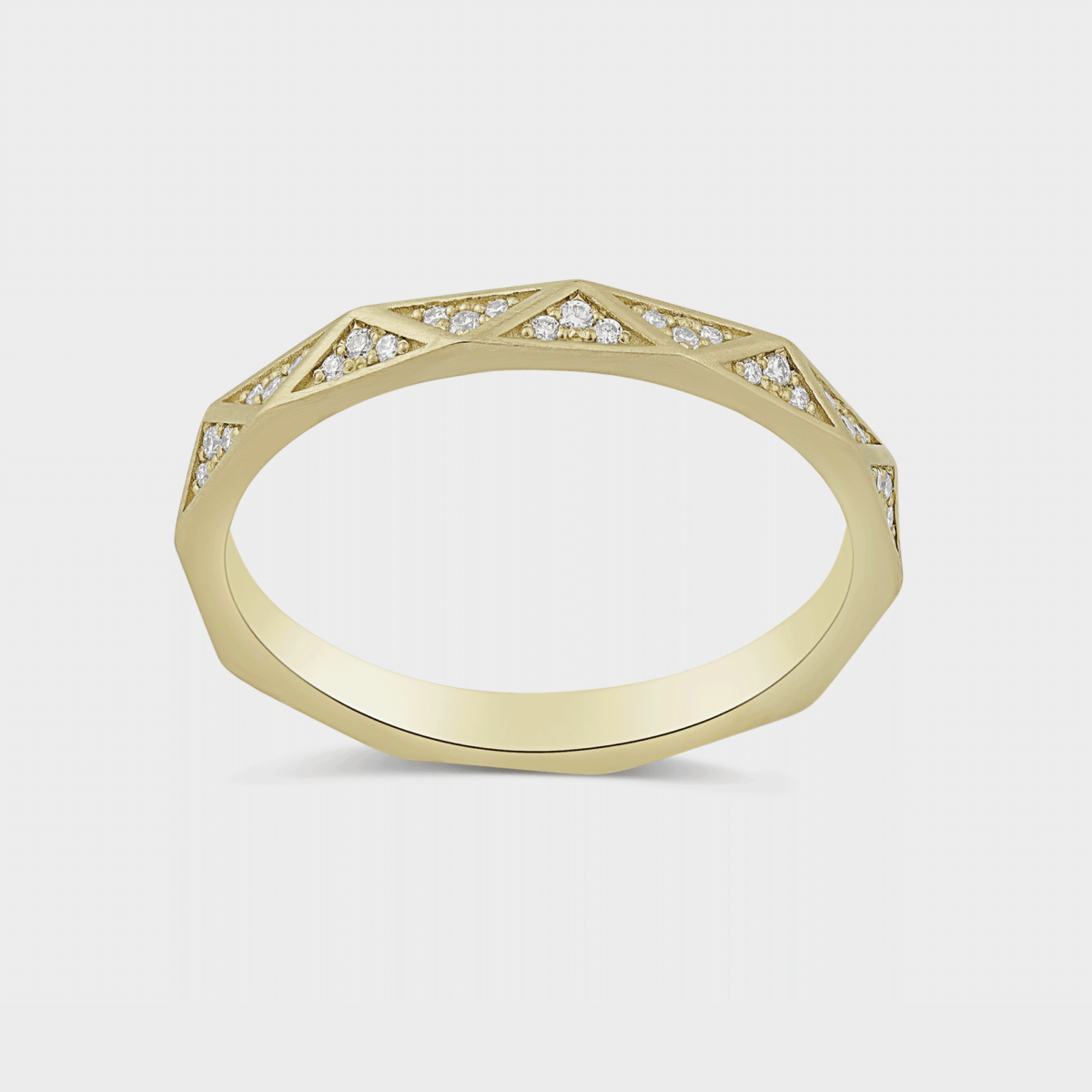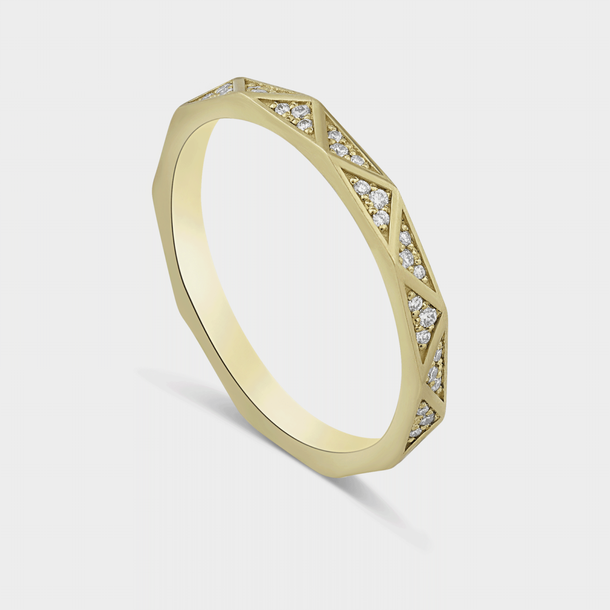טבעת זהב 14K משובצת 33 יהלומים על חצי היקפה. עיטורי משולשים בסגנון קלאסי מודרני.
