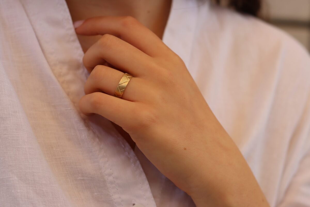 טבעת נישואין מיוחדת המשלבת טקסטורה ומרקמים שונים על כל היקפה. הטבעת עשויה מזהב 14k בעבודת יד ברמת הצורפות הגבוהה ביותר.