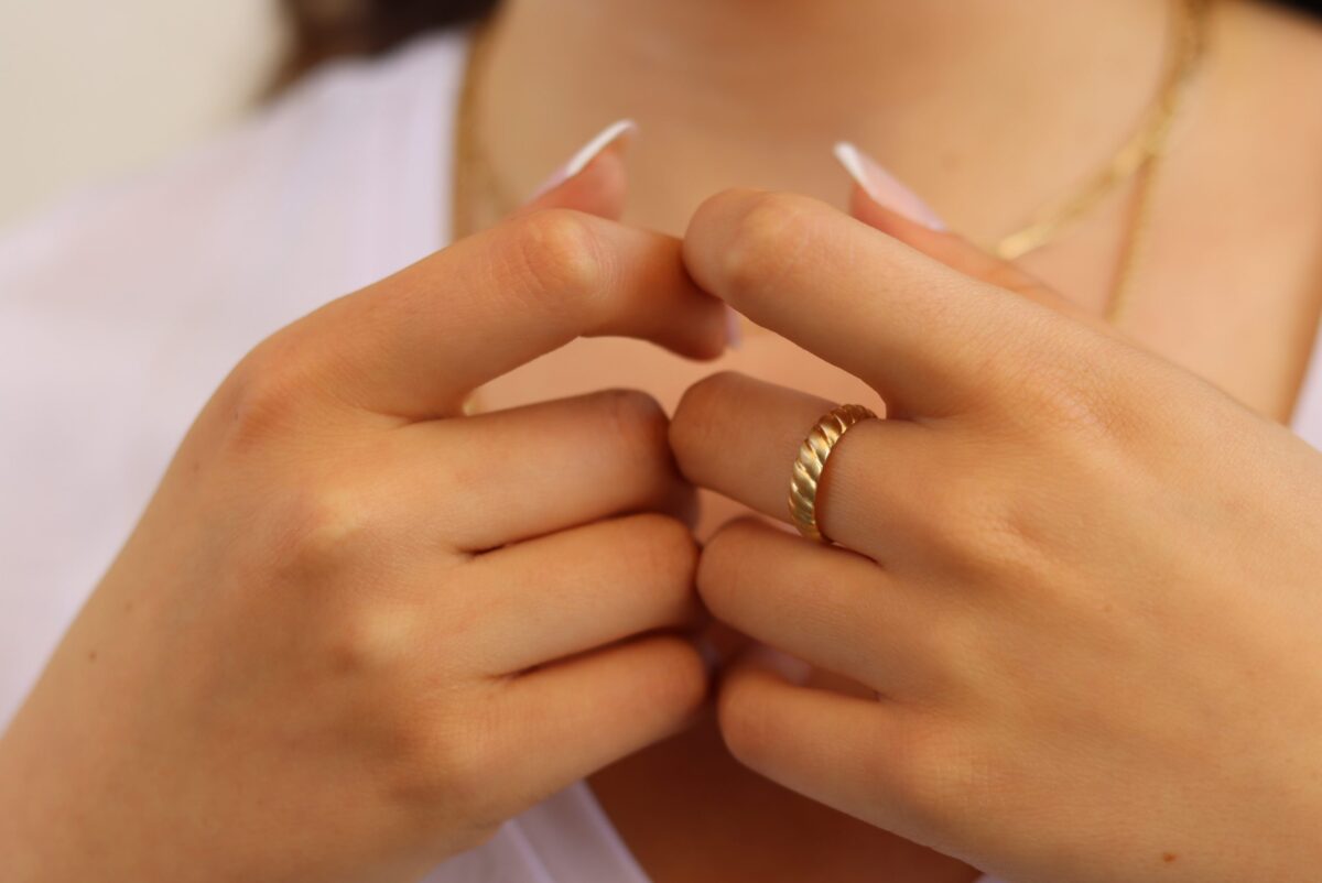 טבעת נישואין עבודת יד מזהב 14k. טבעת מעוצבת בקו גלי אלגנטי וניצחי שתמשוך את כל תשומת הלב אליה.