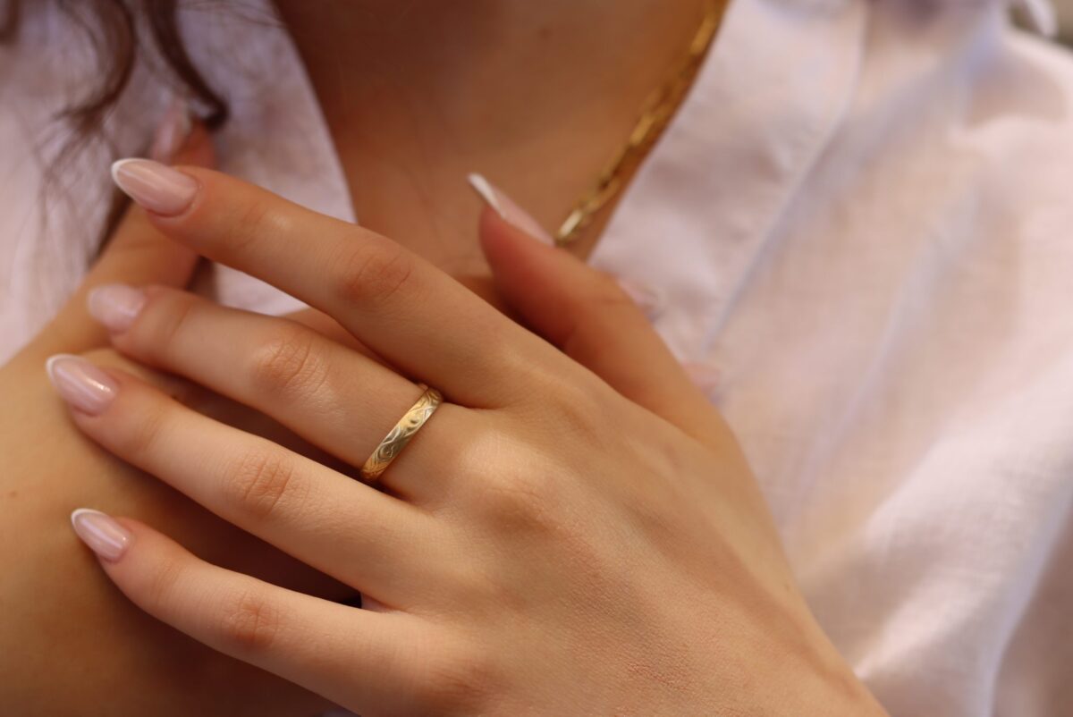 טבעת נישואין מיוחדת המשלבת טקסטורה ומרקמים שונים על כל היקפה. הטבעת עשויה מזהב 14k בעבודת יד ברמת הצורפות הגבוהה ביותר.
