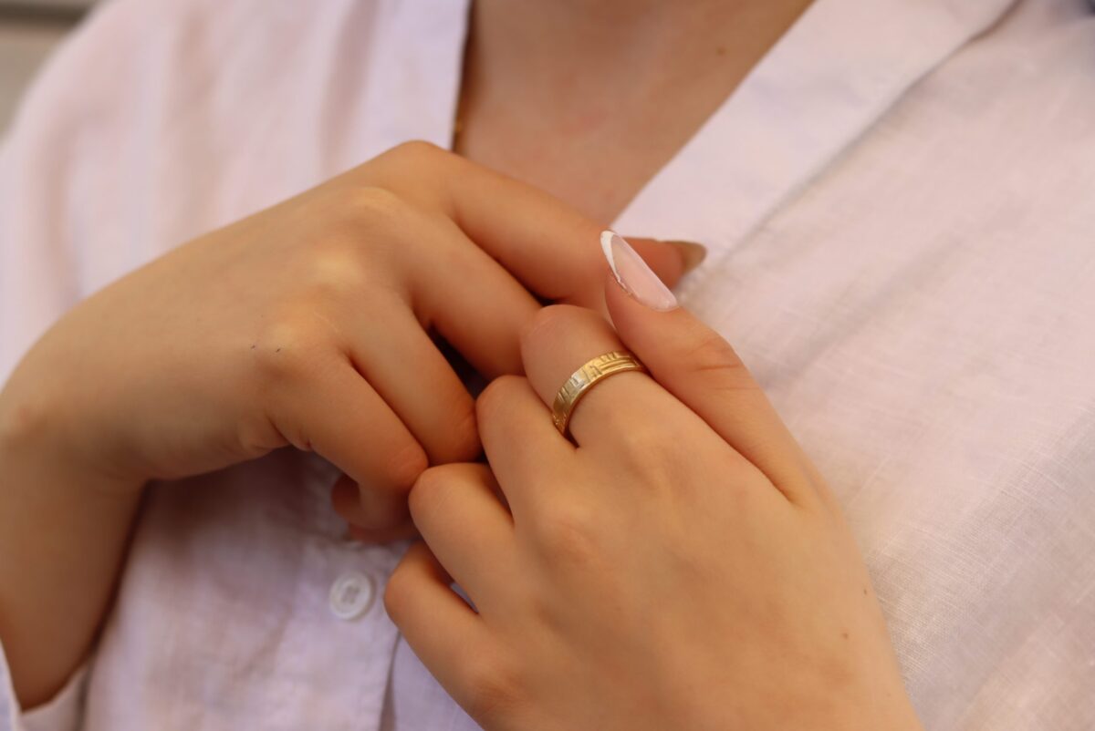 טבעת נישואין במראה עתיק והרבה שיק. הטבעת עשויה זהב 14K.