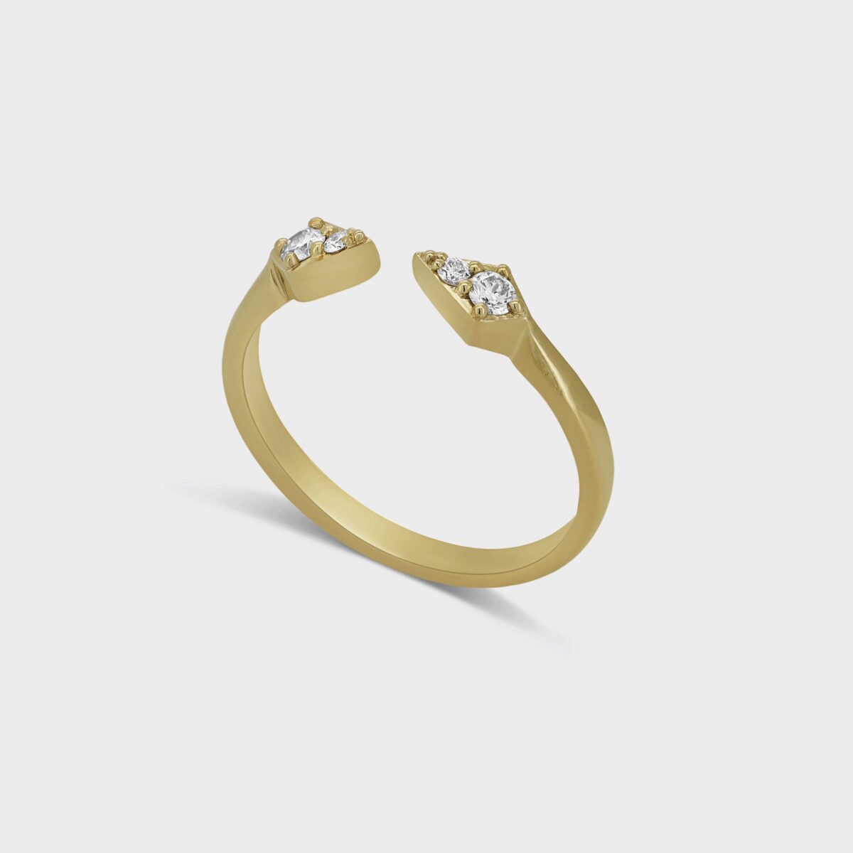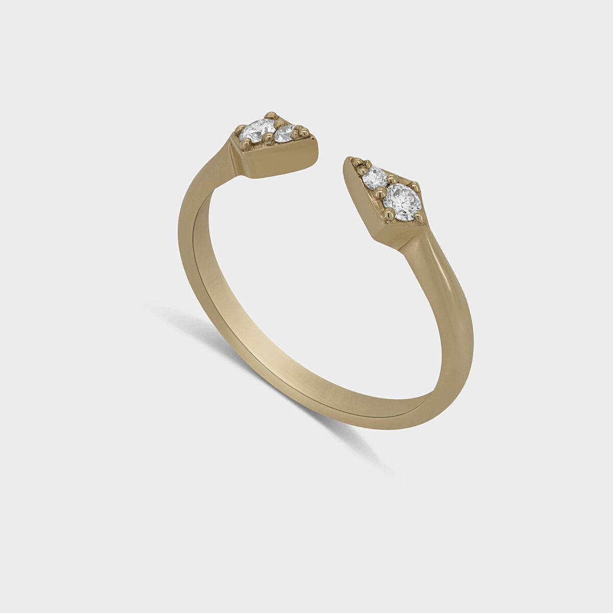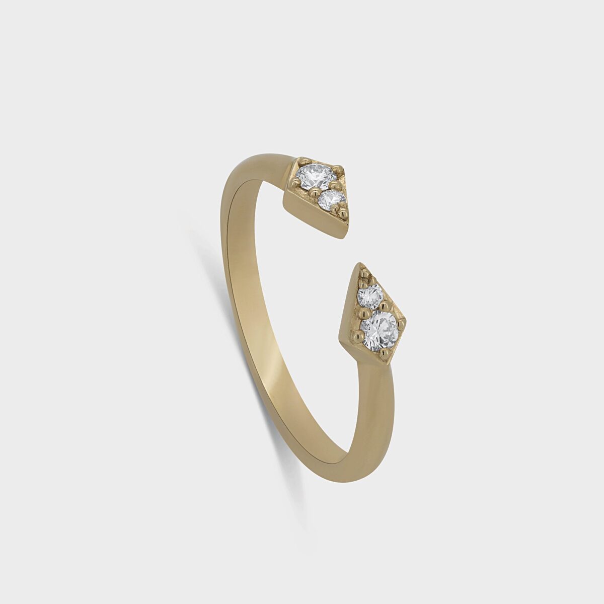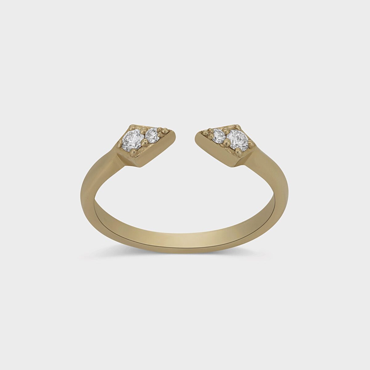 טבעת זהב 14 קרט פתוחה בצורת דלתון משובצת 4 יהלומים. טבעת שיקית ומעניינת.