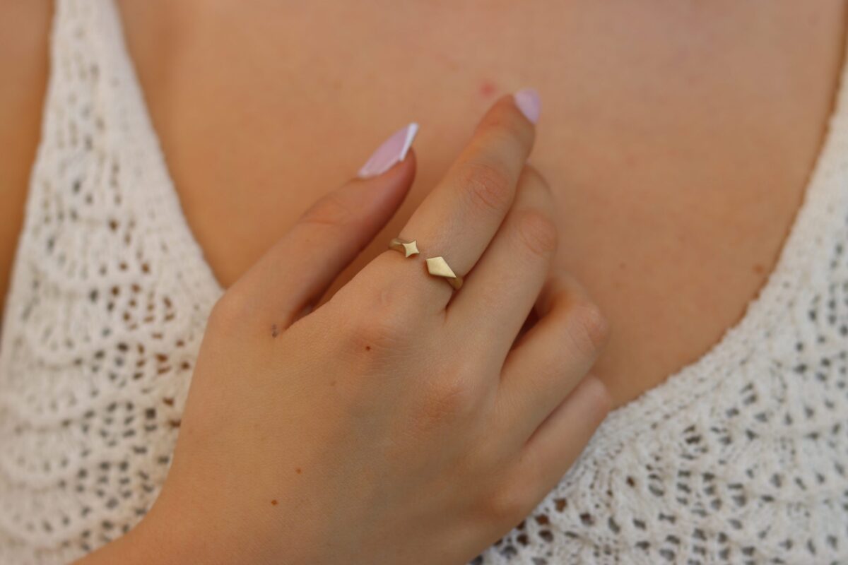 טבעת זהב 14 קרט פתוחה בצורת כוכב וקייט. טבעת ייחודית ומעניינת.