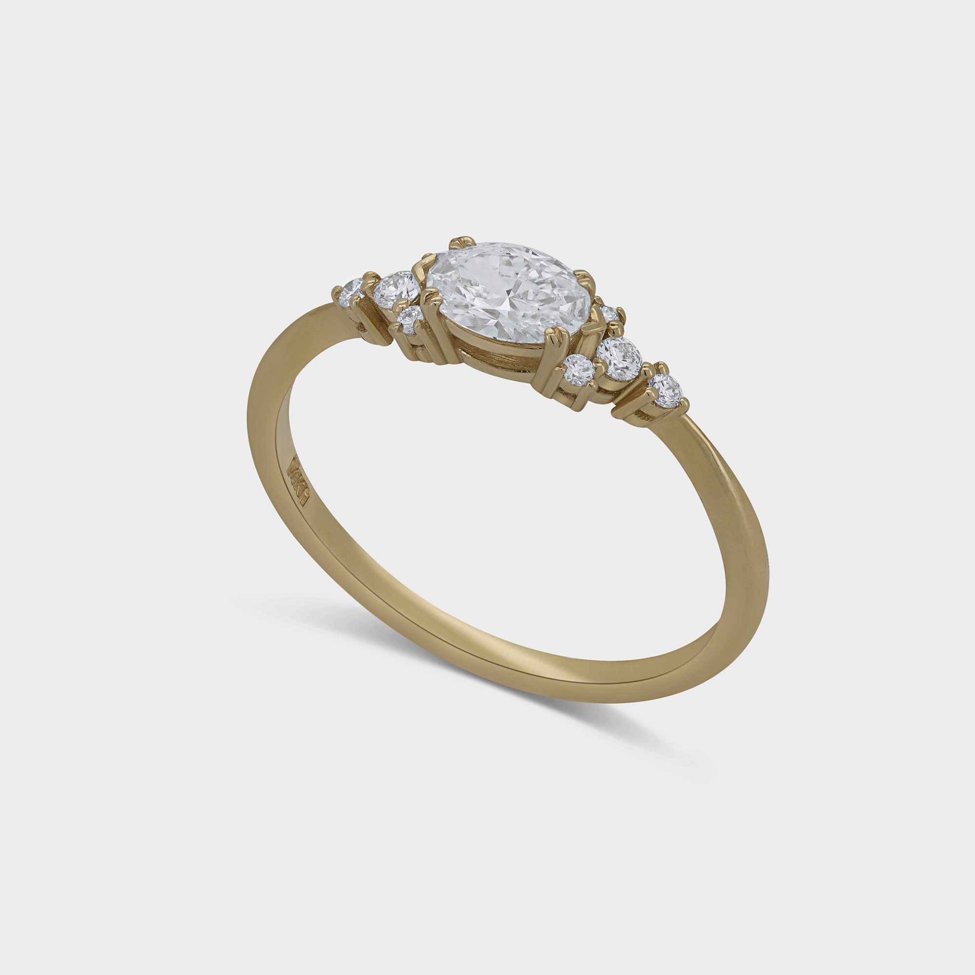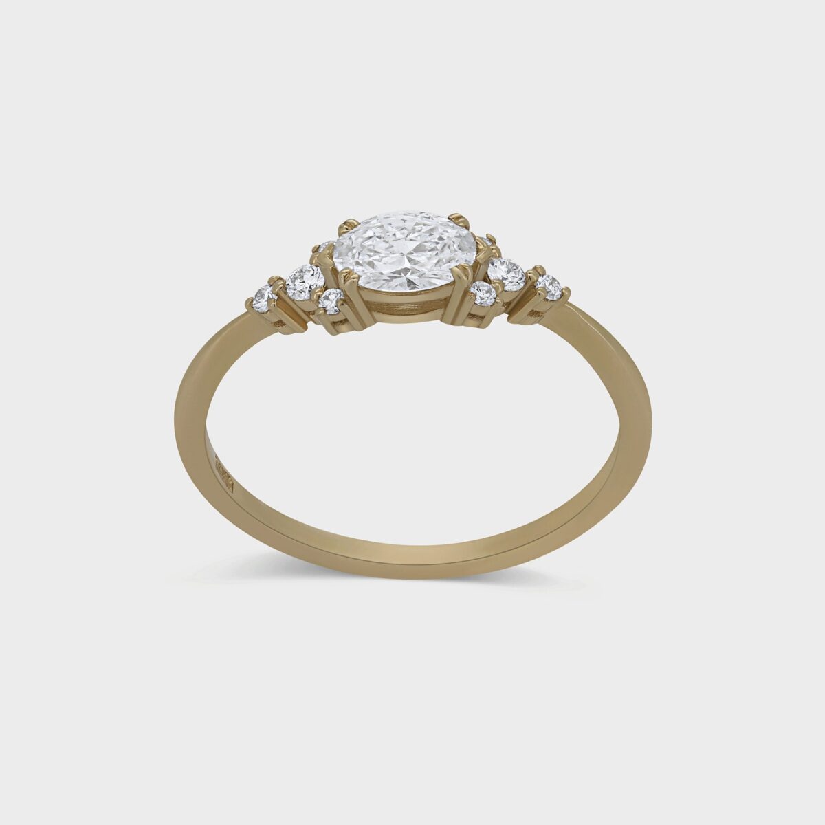 טבעת עוצרת נשימה עשויה זהב 14 קרט משובצת יהלום מרכזי בחיתוך אובלי במשקל 0.37 קרט ובצדדיו 8 יהלומים לבנים. טבעת שיקית ומהפנטת.
