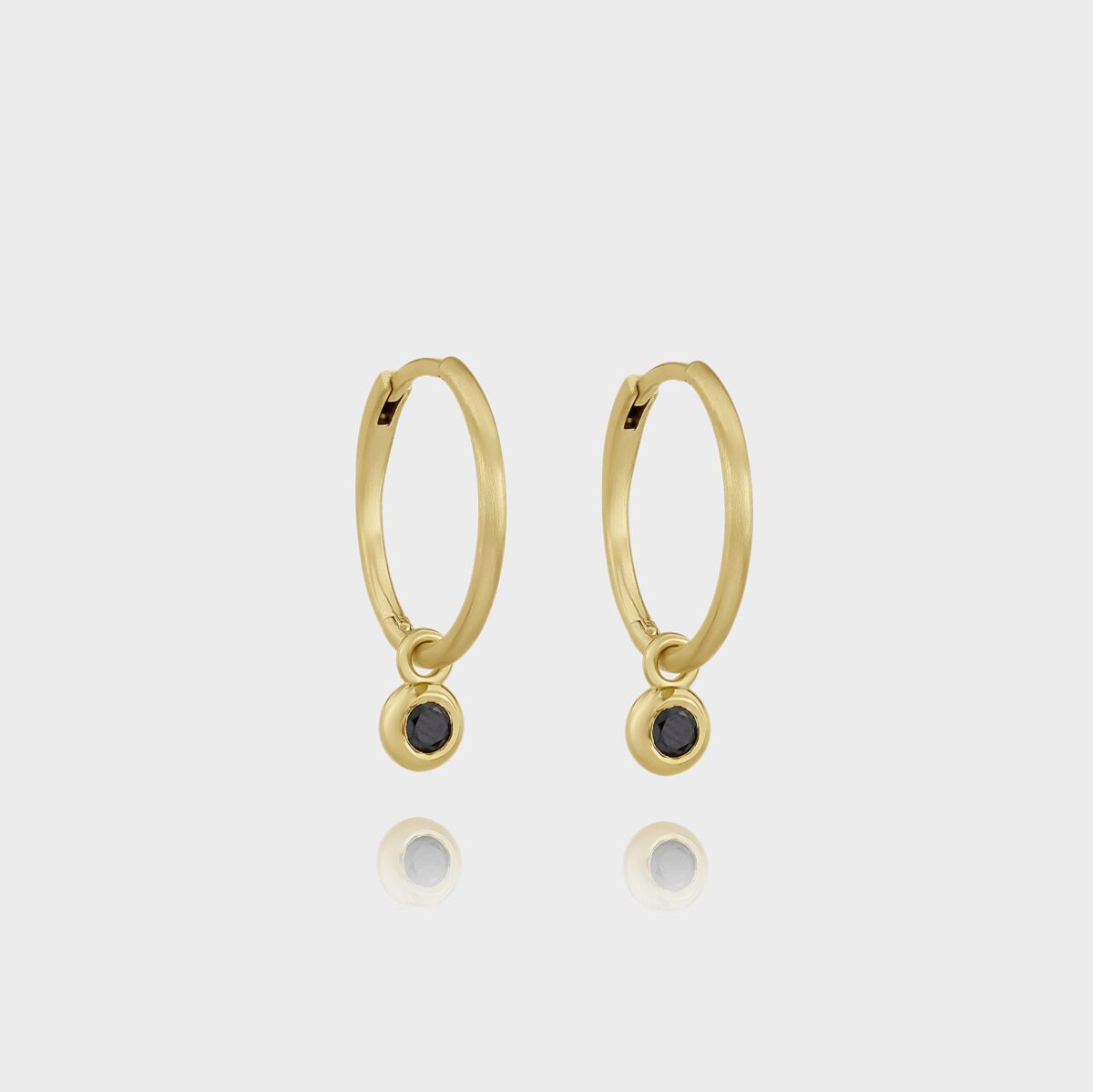 זוג חישוקי זהב 14 קרט בייסיק מהממים, שעל כל חישוק מושחל יהלום שחור מרכזי. העגילים הכי שיקים שאת יכולה לשנות לפי מצב הרוח שלך ומה שהכי מתחשק לך באותו הרגע.