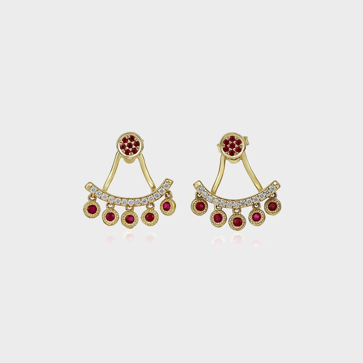 עגילי זהב 14k מרשימים משובצים 26 יהלומים מנצנצים F VS בשילוב הניצחי עם 24 אבני חן רובי במשקל 0.60 קרט המשלימים מראה סקסי וייחודי. העגילים מורכבים משני חלקים, עגילי רובי צמודים ושני מתלי עגילים נוספים המתחברים מאוחרי האוזן
