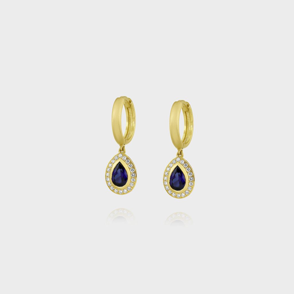 עגילי זהב 14k ייחודיים משובצים 2 יהלומים לבנים F VS במשקל 0.02 קרט ו18 אבני חן ספיר בגוון כחול עמוק במרכז וגווני תכלת ג׳ינס מסביב