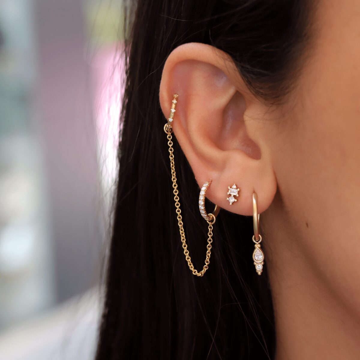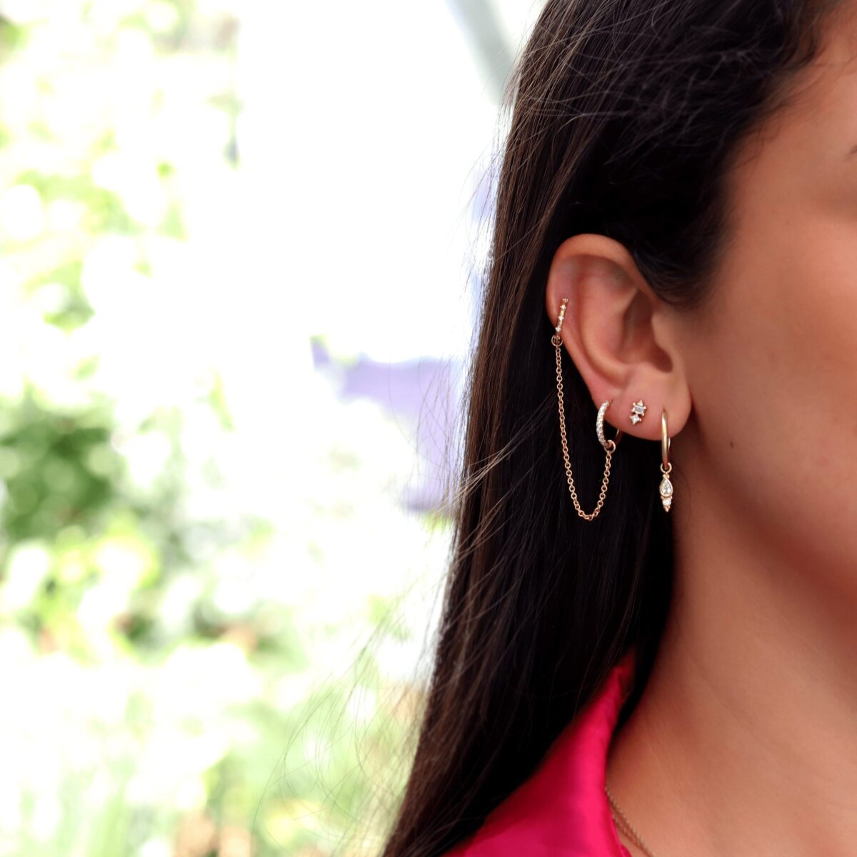 עגילי זהב 14k צמודים מעוצבים בצורה מיוחדת שלא תראי בשום מקום. כל עגיל משובץ ביהלום בגט בחיתוך מלבני, יהלום קארה בחיתוך מרובע ויהלום עגול בעיצוב שיקי ועל זמני עם איכות חסרת פשרות.