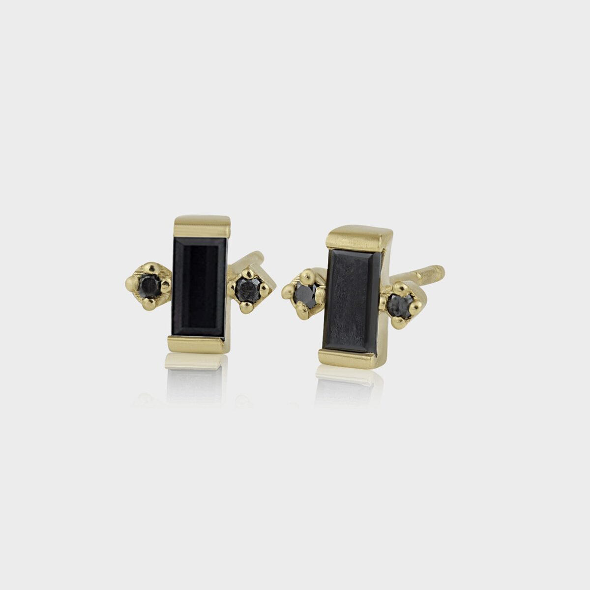 עגילי זהב 14k צמודים מעוצבים בצורה מיוחדת שלא תראי בשום מקום. כל עגיל משובץ ביהלום שחור בגט בחיתוך מלבני בעיצוב שיקי ועל זמני עם איכות חסרת פשרות.