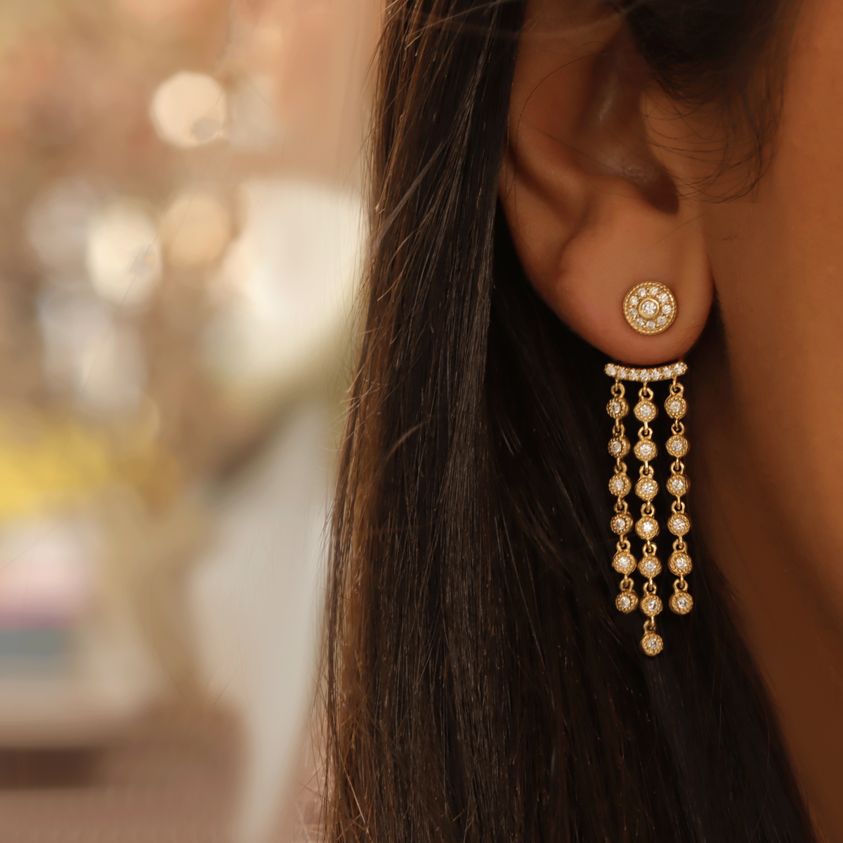 עגילי זהב 14k יוקרתיים ואומנותיים משובצים יהלומים F VS במשקל כולל של 0.92 קרט. העגילים מורכבים משני חלקים וניתן לענוד אותם גם כעגילים צמודים ללא המתלה האחורי.