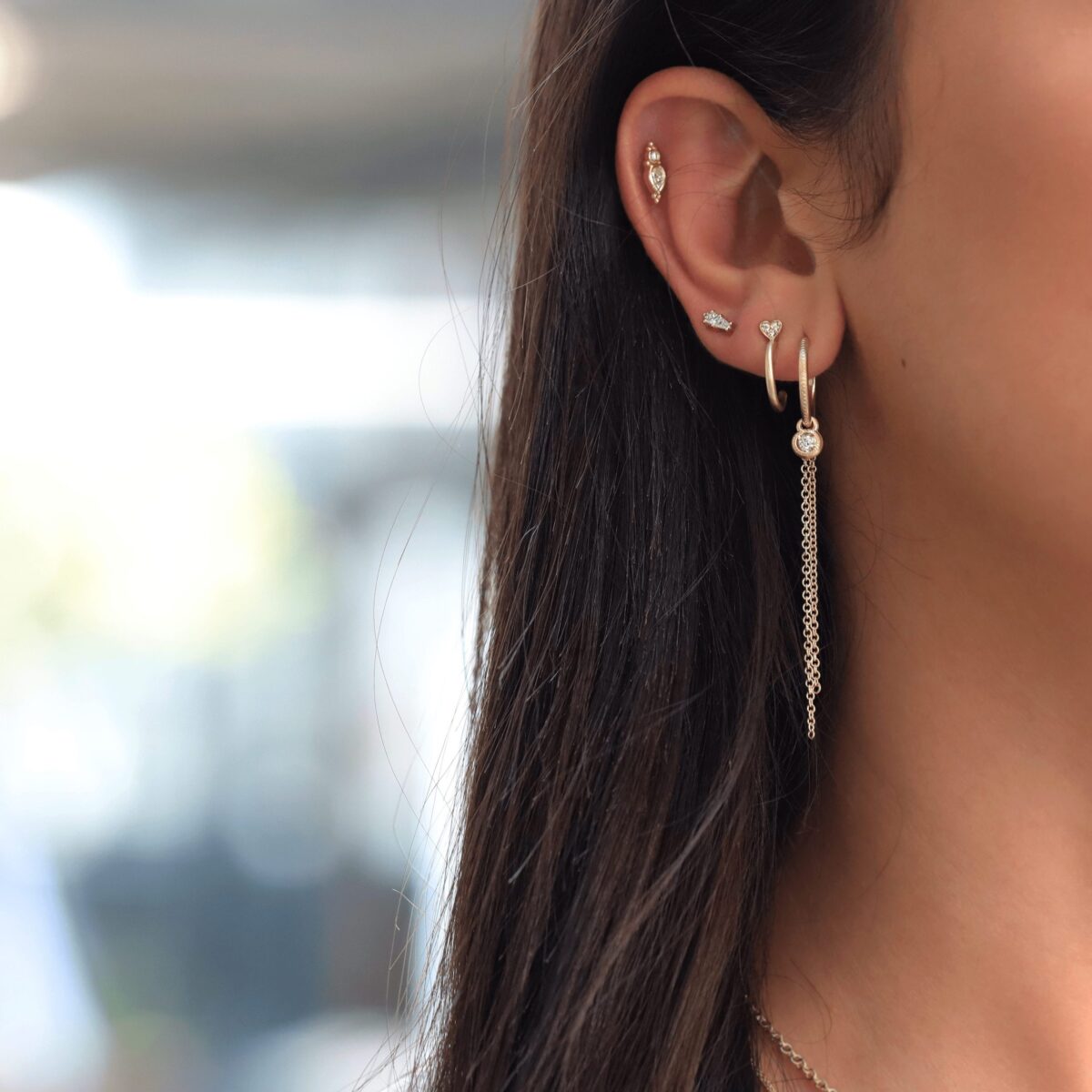 עגילי זהב 14k צמודים מעוצבים בצורה מיוחדת שלא תראי בשום מקום. כל עגיל משובץ ביהלום בחיתוך טיפה ויהלום עגול בעיצוב שיקי ועל זמני עם איכות חסרת פשרות.