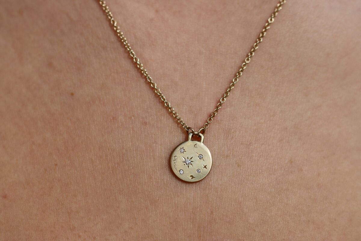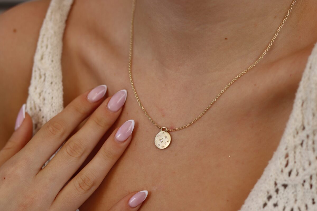 שרשרת גלקסיה זהב 14k מעוצבת משובצת 5 יהלומים לבנים. שיבוץ השרשרת מעניק לה מראה ייחודי ונעשה כמובן בעבודת יד מדויקת תוך הוספת אלמנטים של משולשים וצורות גיאומטריות החצובות בזהב.