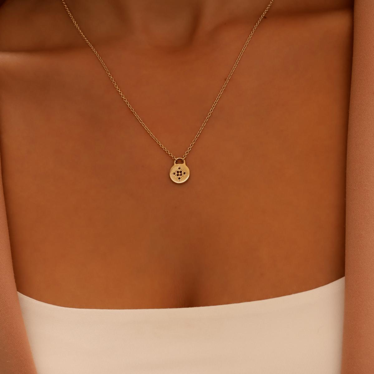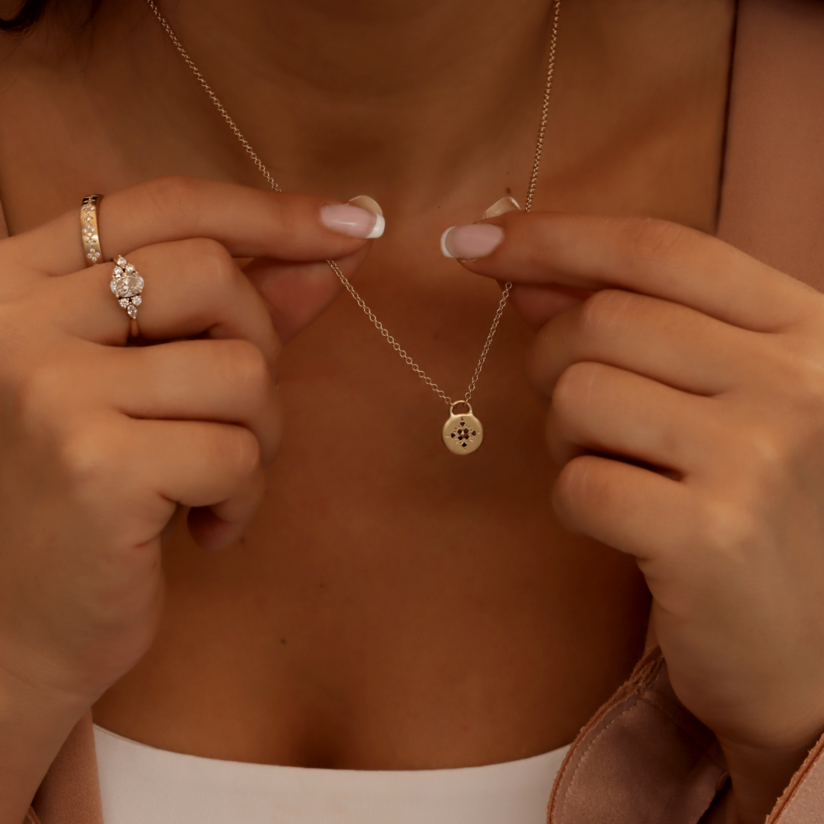 תליון זהב 14k בעבודת יד עם שיבוצים של יהלומים שחורים במבנה ייחודי שמושך את העין