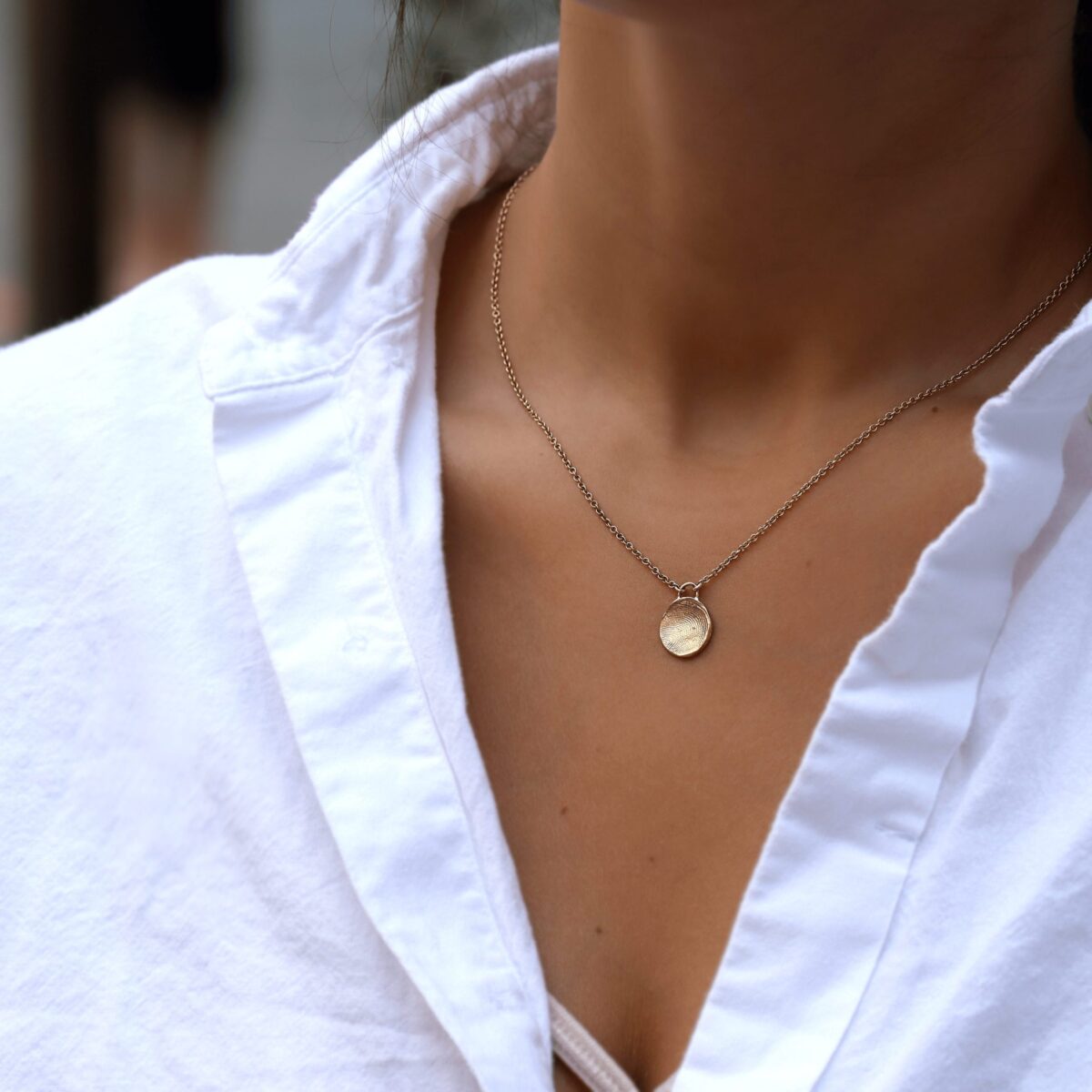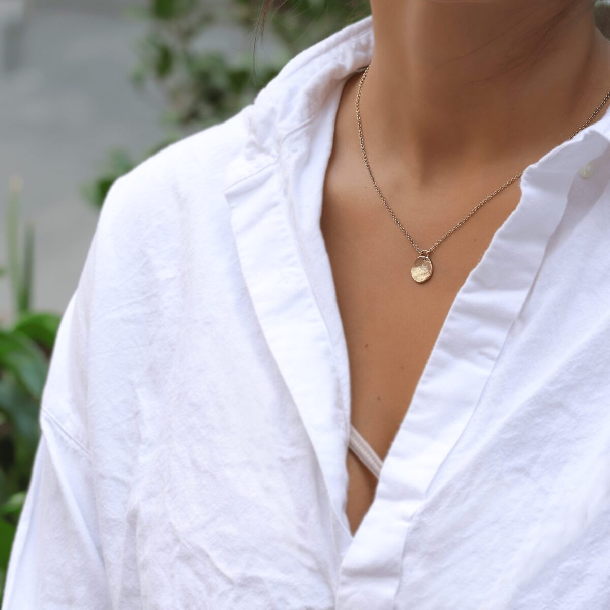 שרשרת מרגשת ואישית עם טביעות אצבע של אהוביך בזהב 14k. טביעת האצבע תוטבע בטבעת בעבודת יד בטכניקה ייחודית. אנא התקשרו אלינו לתיאום החוויה המשותפת שלנו בסטודיו.