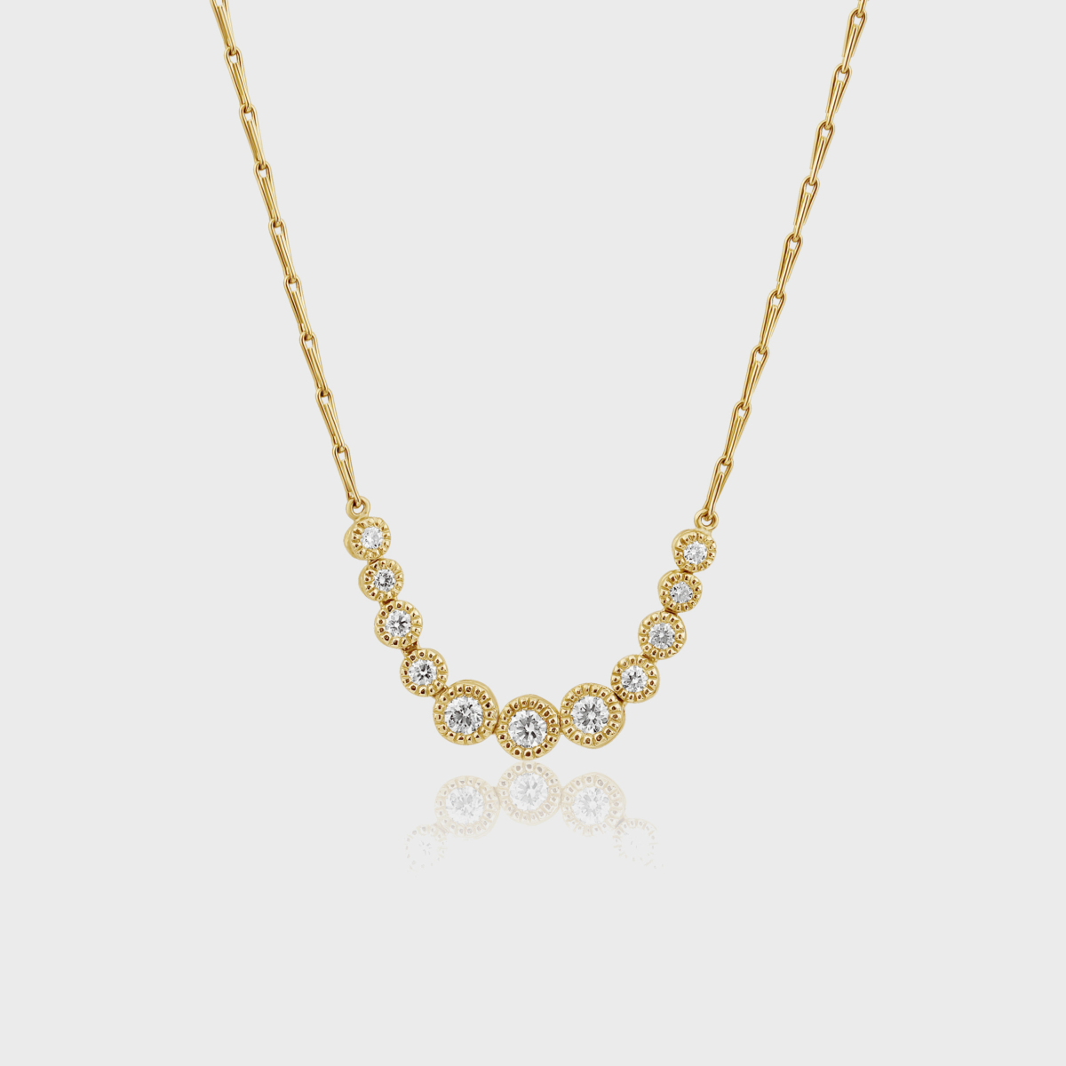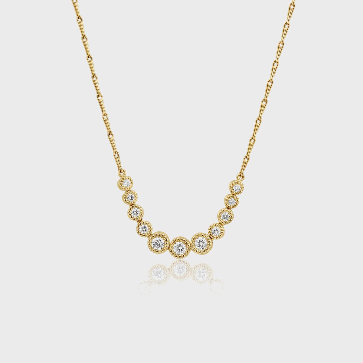 שרשרת זהב 14k מעוצבת משובצת 11 יהלומים לבנים F VS במשקל כולל של 0.76 קרט. שיבוץ השרשרת מעניק לה מראה ייחודי ונעשה כמובן בעבודת יד מדויקת תוך חציבה של כדורים קטנים בזהב סביב כל יהלום.