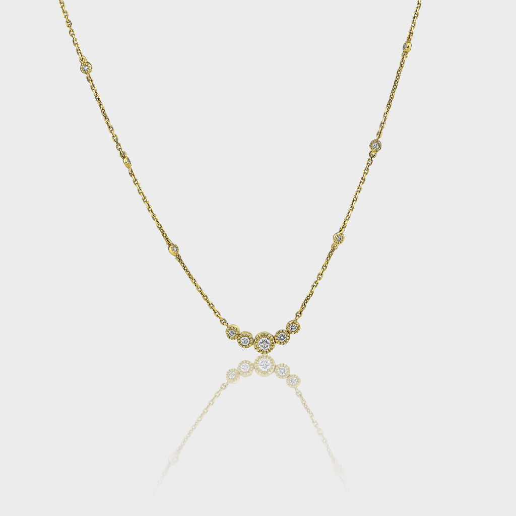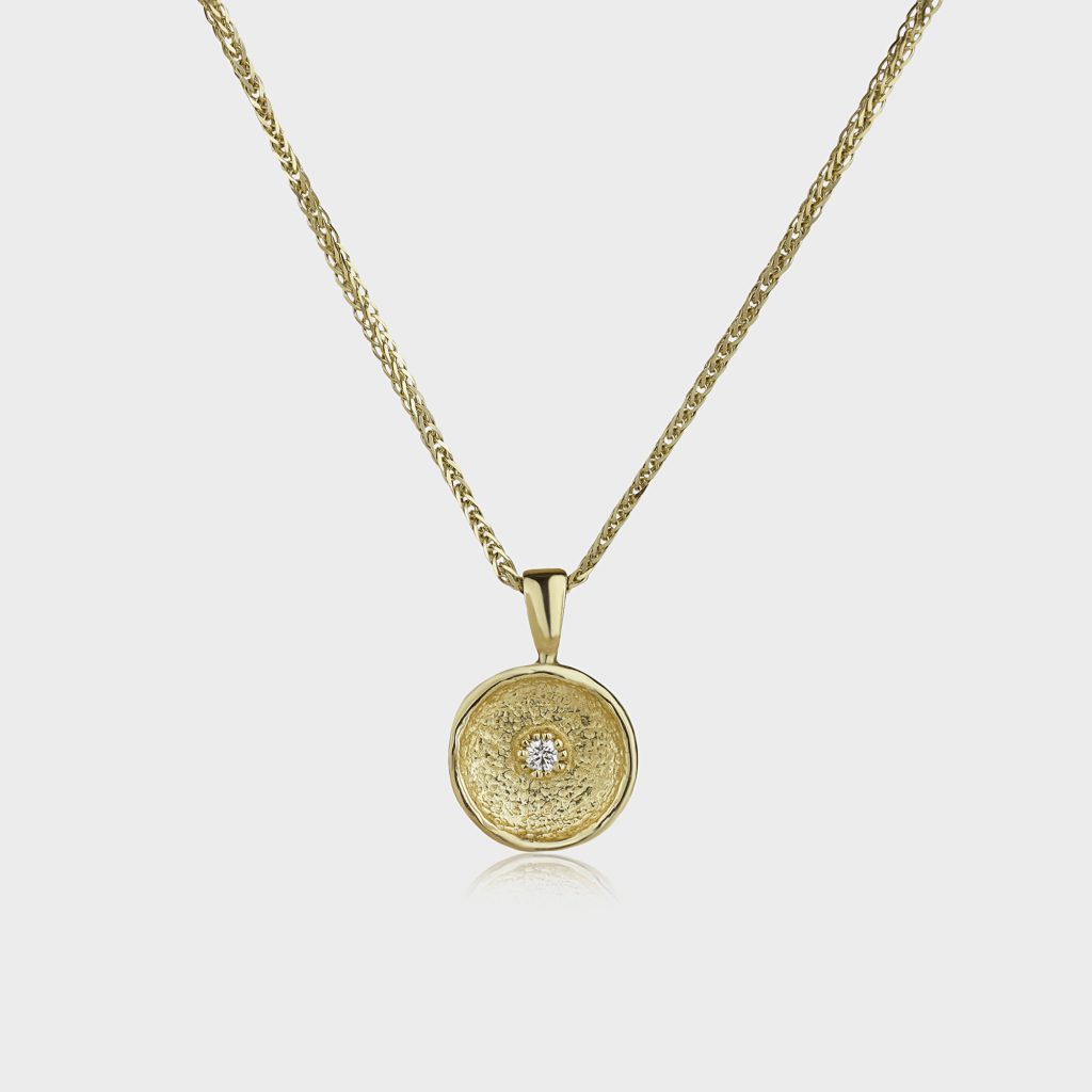 שרשרת זהב 14k מעוצבת משובצת 5 יהלומים לבנים. שיבוץ השרשרת מעניק לה מראה ייחודי ונעשה כמובן בעבודת יד מדויקת תוך הוספת אלמנטים של משולשים וצורות גיאומטריות החצובות בזהב.