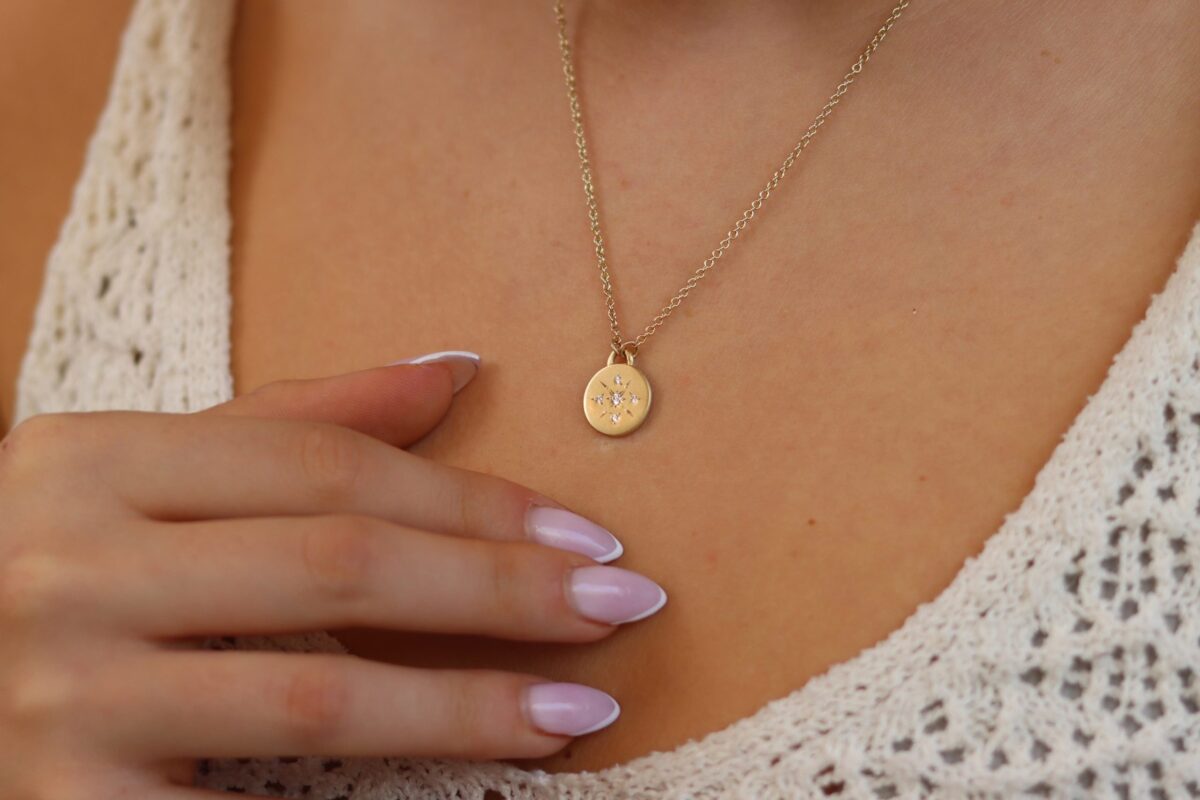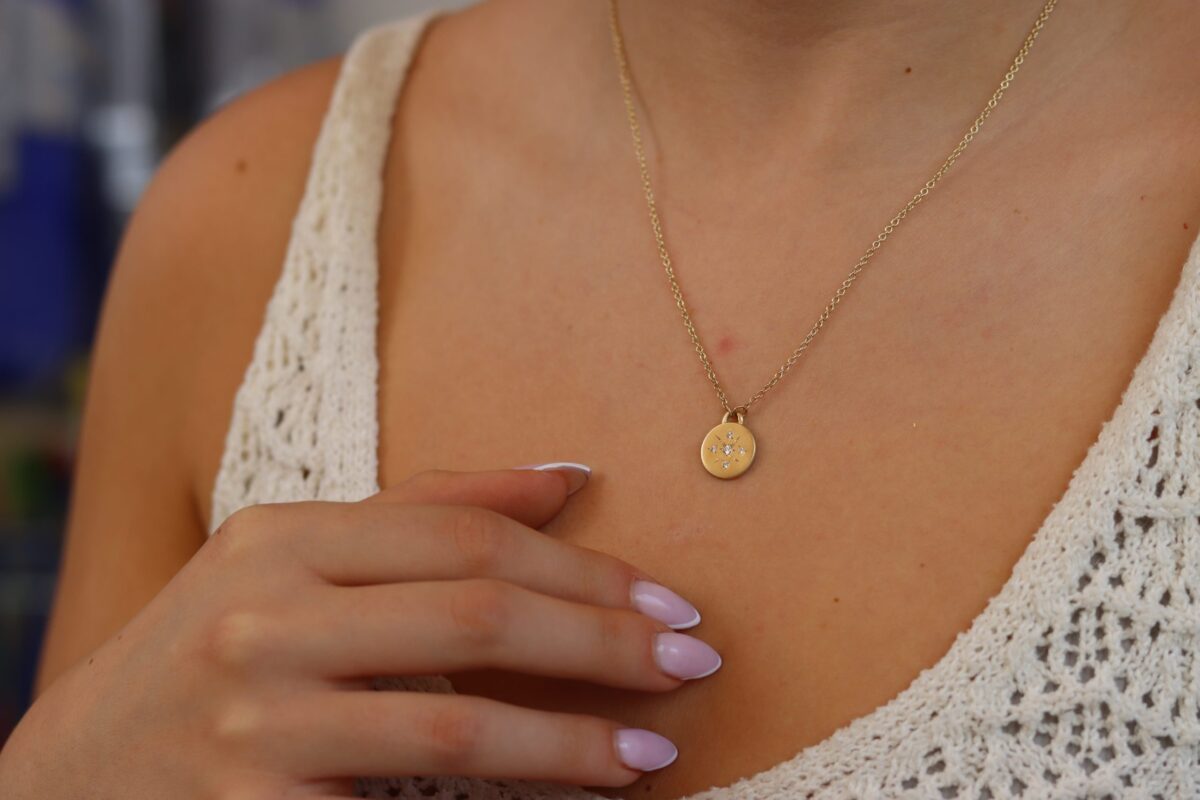 שרשרת זהב 14k מעוצבת משובצת 5 יהלומים לבנים. שיבוץ השרשרת מעניק לה מראה ייחודי ונעשה כמובן בעבודת יד מדויקת תוך הוספת אלמנטים של משולשים וצורות גיאומטריות החצובות בזהב.