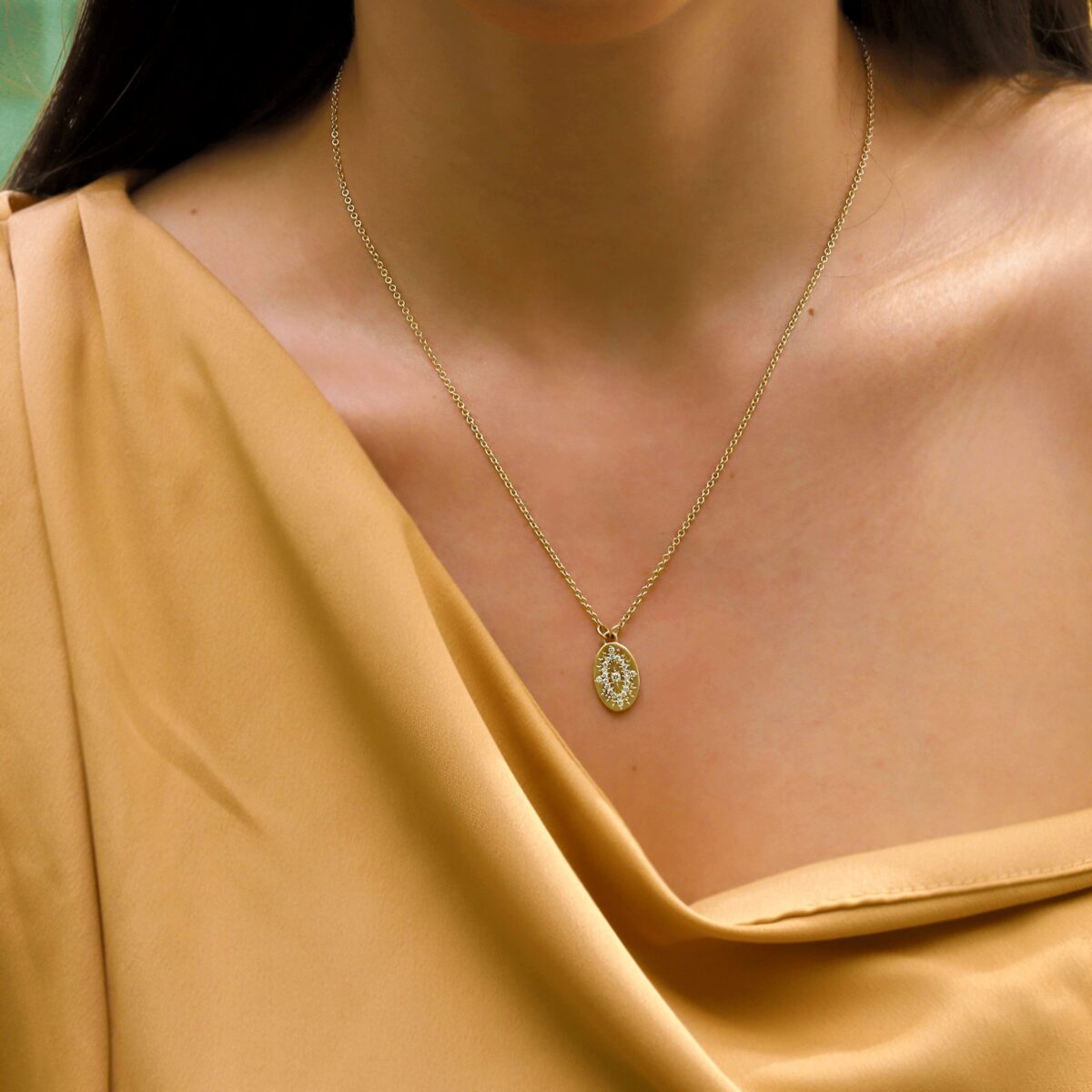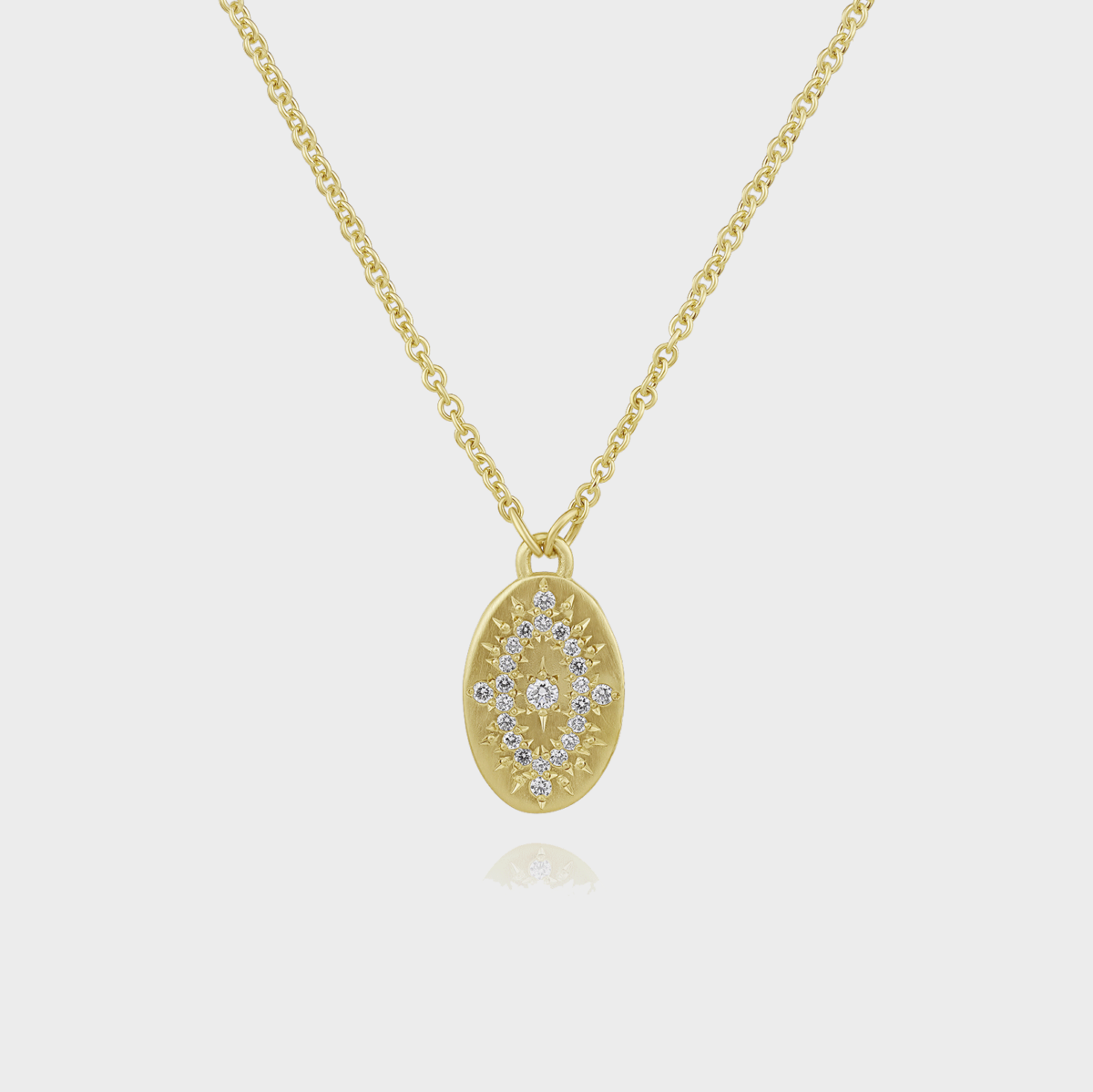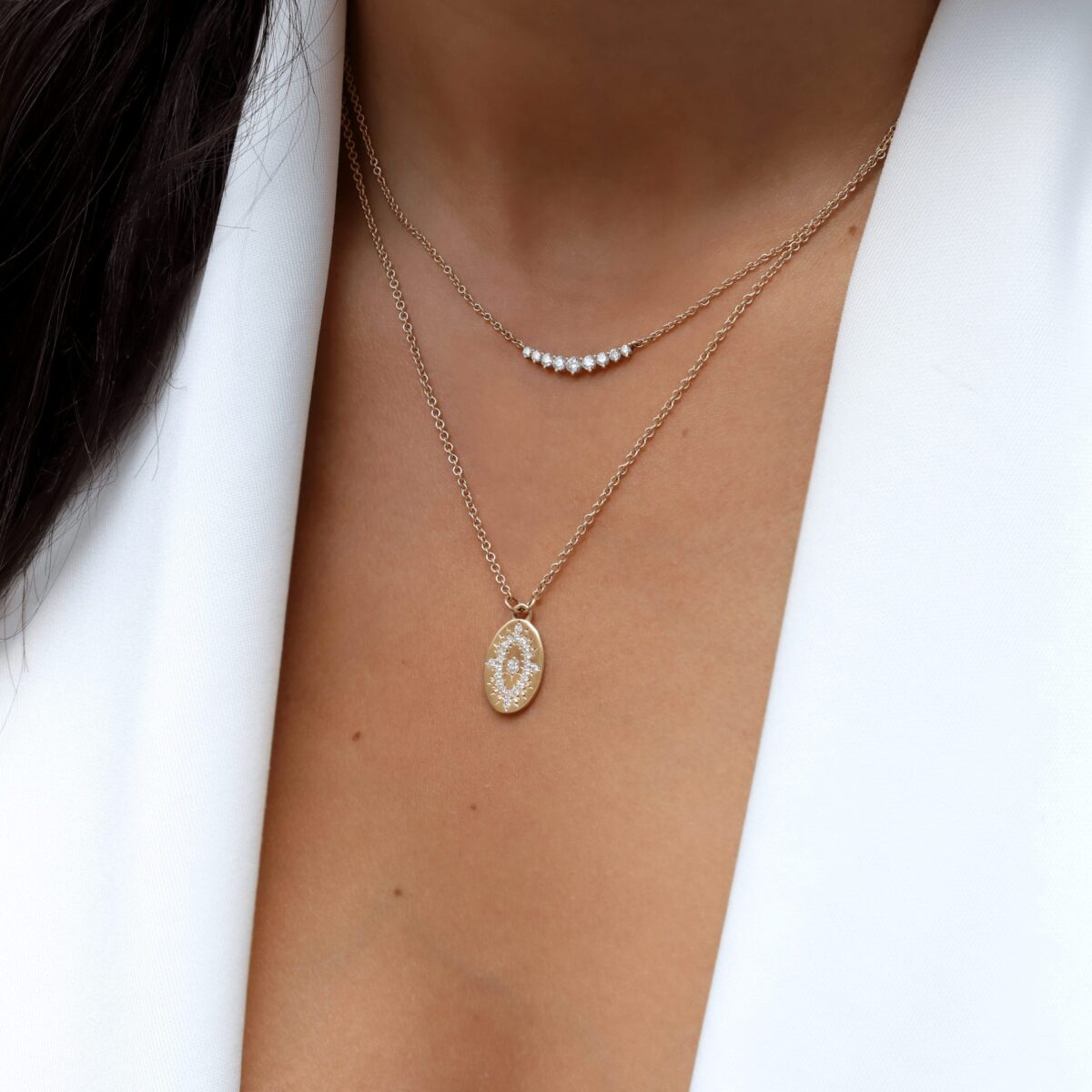 שרשרת זהב 14k מעוצבת משובצת 23 יהלומים לבנים F VS במשקל כולל של 0.18 קרט. שיבוץ השרשרת מעניק לה מראה ייחודי ונעשה כמובן בעבודת יד מדויקת תוך הוספת אלמנטים של משולשים וצורות גיאומטריות החצובות בזהב.