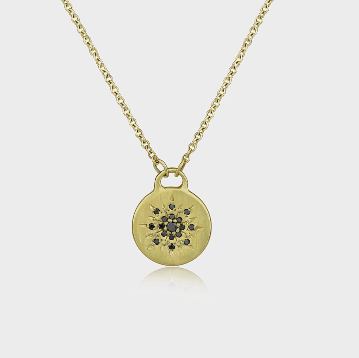 שרשרת זהב 14k מעוצבת משובצת 17 יהלומים שחורים במשקל 0.12 קרט. שיבוץ השרשרת מעניק לה מראה ייחודי ונעשה כמובן בעבודת יד מדויקת תוך הוספת אלמנטים של משולשים וצורות גיאומטריות החצובות בזהב.